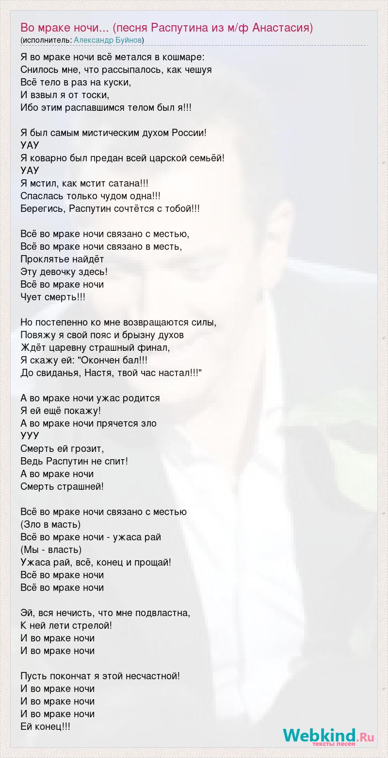 Я во мраке ночи всё метался в кошмаре: Снилось мне, что рассыпалось, как чешуя Всё тело в раз на куски, И взвыл я от тоски, Ибо этим распавшимся телом был я!!! Я был самым мистическим духом России! УАУ Я коварно был предан всей царской семьёй! УАУ Я мстил, как мстит сатана!!! Спаслась только чудом одна!!! Берегись, Распутин сочтётся с тобой!!! Всё во мраке ночи связано с местью, Всё во мраке ночи связано в месть, Проклятье найдёт Эту девочку здесь! Всё во мраке ночи Чует смерть!!! Но постепенно ко мне возвращаются силы, Повяжу я свой пояс и брызну духов Ждёт царевну страшный финал, Я скажу ей: "Окончен бал!!! До свиданья, Настя, твой час настал!!!" А во мраке ночи ужас родится Я ей ещё покажу! А во мраке ночи прячется зло УУУ Смерть ей грозит, Ведь Распутин не спит! А во мраке ночи Смерть страшней! Всё во мраке ночи связано с местью (Зло в масть) Всё во мраке ночи - ужаса рай (Мы - власть) Ужаса рай, всё, конец и прощай! Всё во мраке ночи Всё во мраке ночи Эй, вся нечисть, что мне подвластна, К ней лети стрелой! И во мраке ночи И во мраке ночи Пусть покончат я этой несчастной! И во мраке ночи И во мраке ночи И во мраке ночи Ей конец!!!