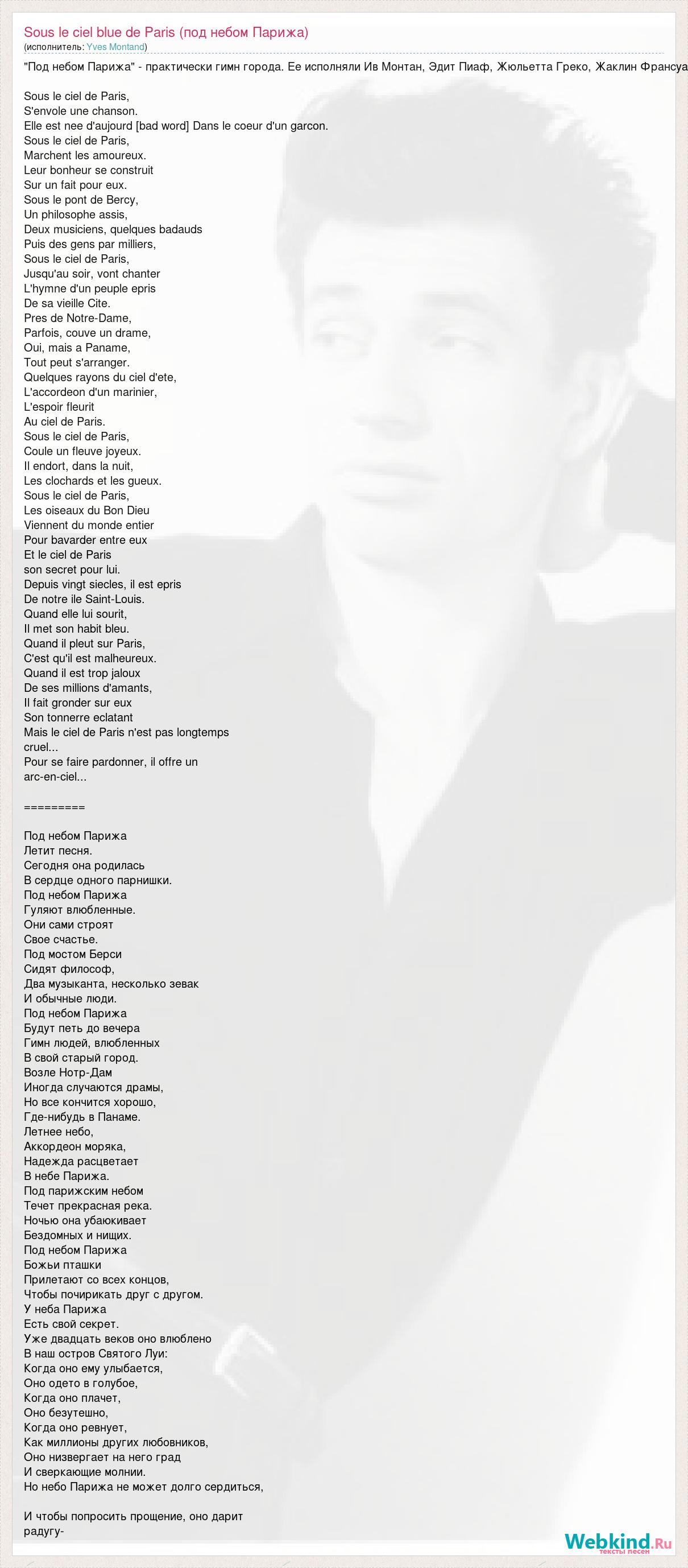 "Под небом Парижа" - практически гимн города. Ее исполняли Ив Монтан, Эдит Пиаф, Жюльетта Греко, Жаклин Франсуа Sous le ciel de Paris, S'envole une chanson. Elle est nee d'aujourd [bad word] Dans le coeur d'un garcon. Sous le ciel de Paris, Marchent les amoureux. Leur bonheur se construit Sur un fait pour eux. Sous le pont de Bercy, Un philosophe assis, Deux musiciens, quelques badauds Puis des gens par milliers, Sous le ciel de Paris, Jusqu'au soir, vont chanter L'hymne d'un peuple epris De sa vieille Cite. Pres de Notre-Dame, Parfois, couve un drame, Oui, mais a Paname, Tout peut s'arranger. Quelques rayons du ciel d'ete, L'accordeon d'un marinier, L'espoir fleurit Au ciel de Paris. Sous le ciel de Paris, Coule un fleuve joyeux. Il endort, dans la nuit, Les clochards et les gueux. Sous le ciel de Paris, Les oiseaux du Bon Dieu Viennent du monde entier Pour bavarder entre eux Et le ciel de Paris son secret pour lui. Depuis vingt siecles, il est epris De notre ile Saint-Louis. Quand elle lui sourit, Il met son habit bleu. Quand il pleut sur Paris, C'est qu'il est malheureux. Quand il est trop jaloux De ses millions d'amants, Il fait gronder sur eux Son tonnerre eclatant Mais le ciel de Paris n'est pas longtemps cruel... Pour se faire pardonner, il offre un arc-en-ciel... ========= Под небом Парижа Летит песня. Сегодня она родилась В сердце одного парнишки. Под небом Парижа Гуляют влюбленные. Они сами строят Свое счастье. Под мостом Берси Сидят философ, Два музыканта, несколько зевак И обычные люди. Под небом Парижа Будут петь до вечера Гимн людей, влюбленных В свой старый город. Возле Нотр-Дам Иногда случаются драмы, Но все кончится хорошо, Где-нибудь в Панаме. Летнее небо, Аккордеон моряка, Надежда расцветает В небе Парижа. Под парижским небом Течет прекрасная река. Ночью она убаюкивает Бездомных и нищих. Под небом Парижа Божьи пташки Прилетают со всех концов, Чтобы почирикать друг с другом. У неба Парижа Есть свой секрет. Уже двадцать веков оно влюблено В наш остров Святого Луи: Когда оно ему улыбается, Оно одето в голубое, Когда оно плачет, Оно безутешно, Когда оно ревнует, Как миллионы других любовников, Оно низвергает на него град И сверкающие молнии. Но небо Парижа не может долго сердиться, И чтобы попросить прощение, оно дарит радугу-