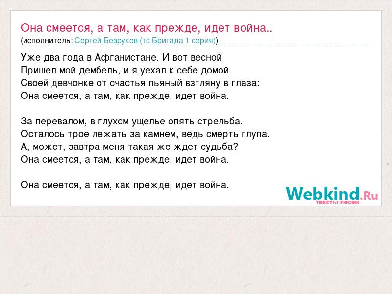 Уже два года в Афганистане. И вот весной Пришел мой дембель, и я уехал к себе домой. Своей девчонке от счастья пьяный взгляну в глаза: Она смеется, а там, как прежде, идет война. За перевалом, в глухом ущелье опять стрельба. Осталось трое лежать за камнем, ведь смерть глупа. А, может, завтра меня такая же ждет судьба? Она смеется, а там, как прежде, идет война. Она смеется, а там, как прежде, идет война.