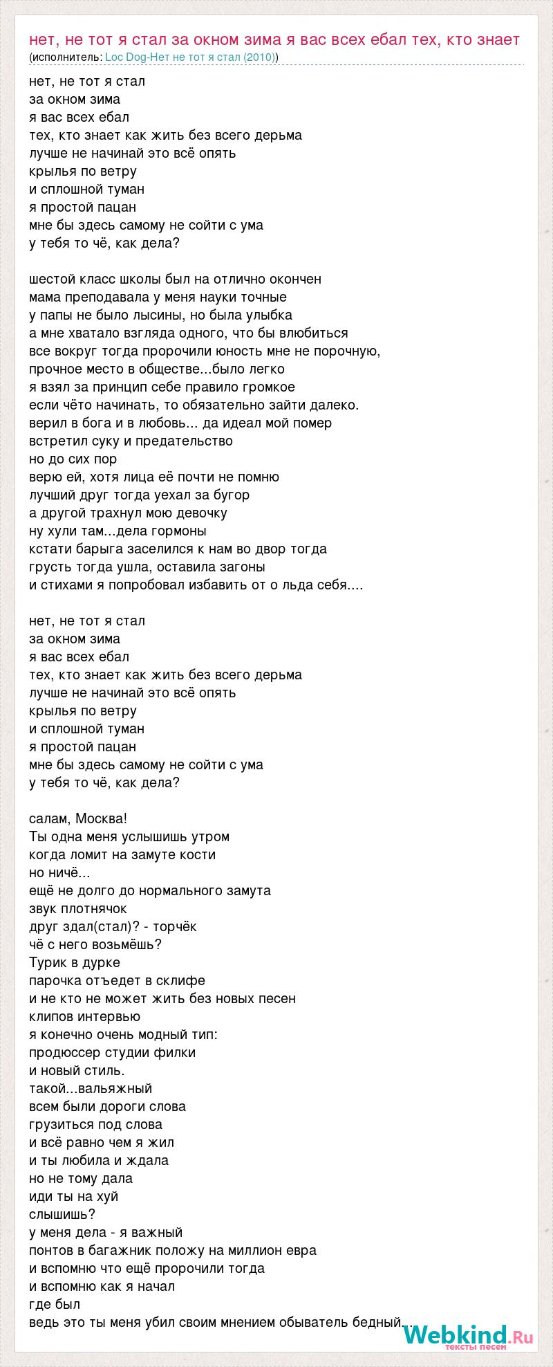 нет, не тот я стал за окном зима я вас всех ебал тех, кто знает как жить без всего дерьма лучше не начинай это всё опять крылья по ветру и сплошной туман я простой пацан мне бы здесь самому не сойти с ума у тебя то чё, как дела? шестой класс школы был на отлично окончен мама преподавала у меня науки точные у папы не было лысины, но была улыбка а мне хватало взгляда одного, что бы влюбиться все вокруг тогда пророчили юность мне не порочную, прочное место в обществе...было легко я взял за принцип себе правило громкое если чёто начинать, то обязательно зайти далеко. верил в бога и в любовь... да идеал мой помер встретил суку и предательство но до сих пор верю ей, хотя лица её почти не помню лучший друг тогда уехал за бугор а другой трахнул мою девочку ну хули там...дела гормоны кстати барыга заселился к нам во двор тогда грусть тогда ушла, оставила загоны и стихами я попробовал избавить от о льда себя.... нет, не тот я стал за окном зима я вас всех ебал тех, кто знает как жить без всего дерьма лучше не начинай это всё опять крылья по ветру и сплошной туман я простой пацан мне бы здесь самому не сойти с ума у тебя то чё, как дела? салам, Москва! Ты одна меня услышишь утром когда ломит на замуте кости но ничё... ещё не долго до нормального замута звук плотнячок друг здал(стал)? - торчёк чё с него возьмёшь? Турик в дурке парочка отъедет в склифе и не кто не может жить без новых песен клипов интервью я конечно очень модный тип: продюссер студии филки и новый стиль. такой...вальяжный всем были дороги слова грузиться под слова и всё равно чем я жил и ты любила и ждала но не тому дала иди ты на хуй слышишь? у меня дела - я важный понтов в багажник положу на миллион евра и вспомню что ещё пророчили тогда и вспомню как я начал где был ведь это ты меня убил своим мнением обыватель бедный...