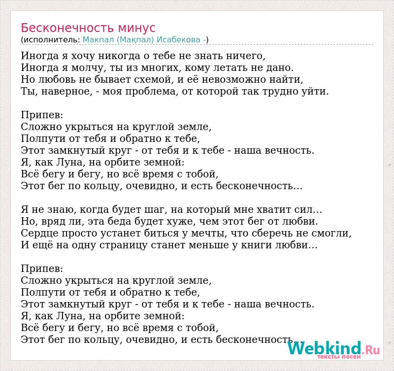 Иногда я хочу никогда о тебе не знать ничего, Иногда я молчу, ты из многих, кому летать не дано. Но любовь не бывает схемой, и её невозможно найти, Ты, наверное, - моя проблема, от которой так трудно уйти. Припев: Сложно укрыться на круглой земле, Полпути от тебя и обратно к тебе, Этот замкнутый круг - от тебя и к тебе - наша вечность. Я, как Луна, на орбите земной: Всё бегу и бегу, но всё время с тобой, Этот бег по кольцу, очевидно, и есть бесконечность… Я не знаю, когда будет шаг, на который мне хватит сил… Но, вряд ли, эта беда будет хуже, чем этот бег от любви. Сердце просто устанет биться у мечты, что сберечь не смогли, И ещё на одну страницу станет меньше у книги любви… Припев: Сложно укрыться на круглой земле, Полпути от тебя и обратно к тебе, Этот замкнутый круг - от тебя и к тебе - наша вечность. Я, как Луна, на орбите земной: Всё бегу и бегу, но всё время с тобой, Этот бег по кольцу, очевидно, и есть бесконечность…