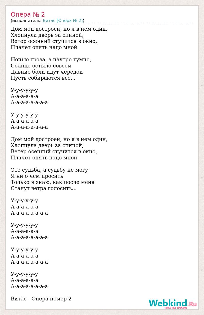 Дом мой достроен, но я в нем один, Хлопнула дверь за спиной, Ветер осенний стучится в окно, Плачет опять надо мной Ночью гроза, а наутро тумно, Солнце остыло совсем Давние боли идут чередой Пусть собираются все... У-у-у-у-у-у А-а-а-а-а-а А-а-а-а-а-а-а-а У-у-у-у-у-у А-а-а-а-а-а А-а-а-а-а-а-а-а Дом мой достроен, но я в нем один, Хлопнула дверь за спиной, Ветер осенний стучится в окно, Плачет опять надо мной Это судьба, а судьбу не могу Я ни о чем просить Только я знаю, как после меня Станут ветра голосить... У-у-у-у-у-у А-а-а-а-а-а А-а-а-а-а-а-а-а У-у-у-у-у-у А-а-а-а-а-а А-а-а-а-а-а-а-а У-у-у-у-у-у А-а-а-а-а-а А-а-а-а-а-а-а-а У-у-у-у-у-у А-а-а-а-а-а А-а-а-а-а-а-а-а Витас - Опера номер 2