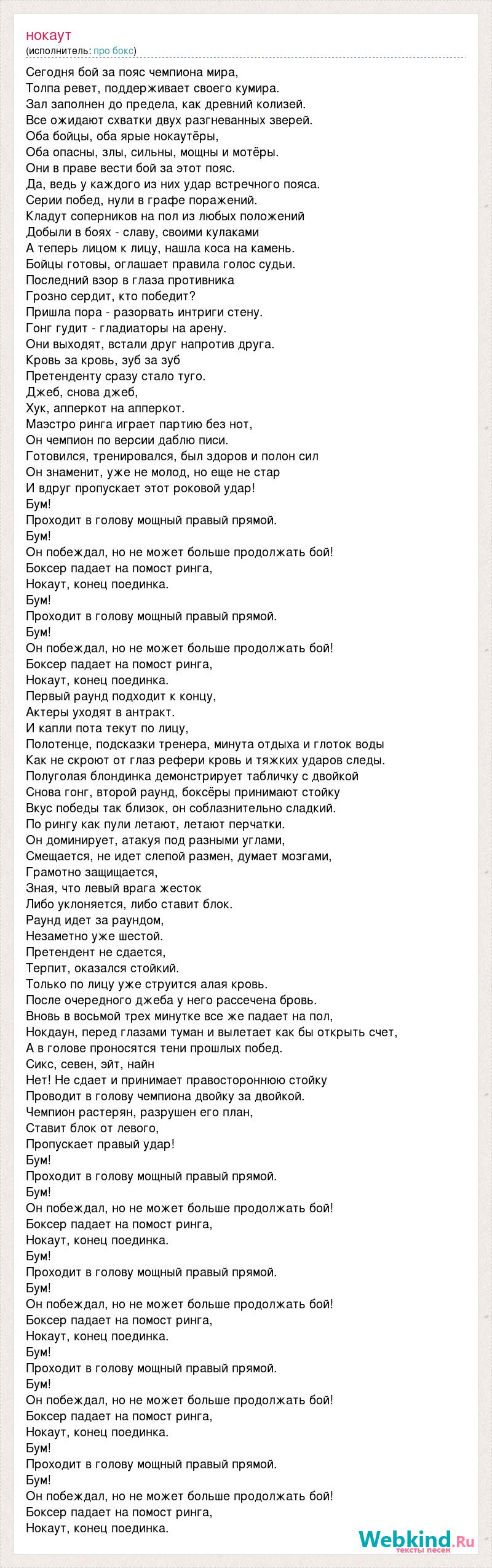 Сегодня бой за пояс чемпиона мира, Толпа ревет, поддерживает своего кумира. Зал заполнен до предела, как древний колизей. Все ожидают схватки двух разгневанных зверей. Оба бойцы, оба ярые нокаутёры, Оба опасны, злы, сильны, мощны и мотёры. Они в праве вести бой за этот пояс. Да, ведь у каждого из них удар встречного пояса. Серии побед, нули в графе поражений. Кладут соперников на пол из любых положений Добыли в боях - славу, своими кулаками А теперь лицом к лицу, нашла коса на камень. Бойцы готовы, оглашает правила голос судьи. Последний взор в глаза противника Грозно сердит, кто победит? Пришла пора - разорвать интриги стену. Гонг гудит - гладиаторы на арену. Они выходят, встали друг напротив друга. Кровь за кровь, зуб за зуб Претенденту сразу стало туго. Джеб, снова джеб, Хук, апперкот на апперкот. Маэстро ринга играет партию без нот, Он чемпион по версии даблю писи. Готовился, тренировался, был здоров и полон сил Он знаменит, уже не молод, но еще не стар И вдруг пропускает этот роковой удар! Бум! Проходит в голову мощный правый прямой. Бум! Он побеждал, но не может больше продолжать бой! Боксер падает на помост ринга, Нокаут, конец поединка. Бум! Проходит в голову мощный правый прямой. Бум! Он побеждал, но не может больше продолжать бой! Боксер падает на помост ринга, Нокаут, конец поединка. Первый раунд подходит к концу, Актеры уходят в антракт. И капли пота текут по лицу, Полотенце, подсказки тренера, минута отдыха и глоток воды Как не скроют от глаз рефери кровь и тяжких ударов следы. Полуголая блондинка демонстрирует табличку с двойкой Снова гонг, второй раунд, боксёры принимают стойку Вкус победы так близок, он соблазнительно сладкий. По рингу как пули летают, летают перчатки. Он доминирует, атакуя под разными углами, Смещается, не идет слепой размен, думает мозгами, Грамотно защищается, Зная, что левый врага жесток Либо уклоняется, либо ставит блок. Раунд идет за раундом, Незаметно уже шестой. Претендент не сдается, Терпит, оказался стойкий. Только по лицу уже струится алая кровь. После очередного джеба у него рассечена бровь. Вновь в восьмой трех минутке все же падает на пол, Нокдаун, перед глазами туман и вылетает как бы открыть счет, А в голове проносятся тени прошлых побед. Сикс, севен, эйт, найн Нет! Не сдает и принимает правостороннюю стойку Проводит в голову чемпиона двойку за двойкой. Чемпион растерян, разрушен его план, Ставит блок от левого, Пропускает правый удар! Бум! Проходит в голову мощный правый прямой. Бум! Он побеждал, но не может больше продолжать бой! Боксер падает на помост ринга, Нокаут, конец поединка. Бум! Проходит в голову мощный правый прямой. Бум! Он побеждал, но не может больше продолжать бой! Боксер падает на помост ринга, Нокаут, конец поединка. Бум! Проходит в голову мощный правый прямой. Бум! Он побеждал, но не может больше продолжать бой! Боксер падает на помост ринга, Нокаут, конец поединка. Бум! Проходит в голову мощный правый прямой. Бум! Он побеждал, но не может больше продолжать бой! Боксер падает на помост ринга, Нокаут, конец поединка.