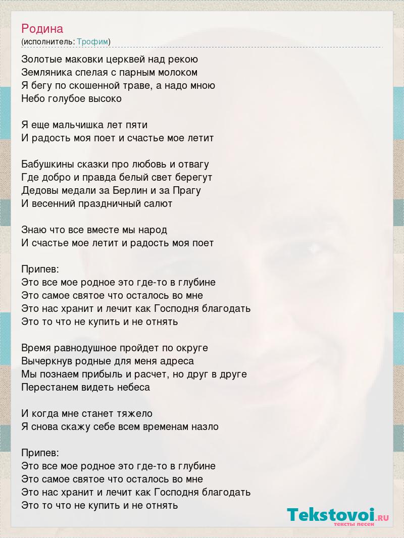Золотые маковки церквей над рекою Земляника спелая с парным молоком Я бегу по скошенной траве, а надо мною Небо голубое высоко Я еще мальчишка лет пяти И радость моя поет и счастье мое летит Бабушкины сказки про любовь и отвагу Где добро и правда белый свет берегут Дедовы медали за Берлин и за Прагу И весенний праздничный салют Знаю что все вместе мы народ И счастье мое летит и радость моя поет Припев: Это все мое родное это где-то в глубине Это самое святое что осталось во мне Это нас хранит и лечит как Господня благодать Это то что не купить и не отнять Время равнодушное пройдет по округе Вычеркнув родные для меня адреса Мы познаем прибыль и расчет, но друг в друге Перестанем видеть небеса И когда мне станет тяжело Я снова скажу себе всем временам назло Припев: Это все мое родное это где-то в глубине Это самое святое что осталось во мне Это нас хранит и лечит как Господня благодать Это то что не купить и не отнять