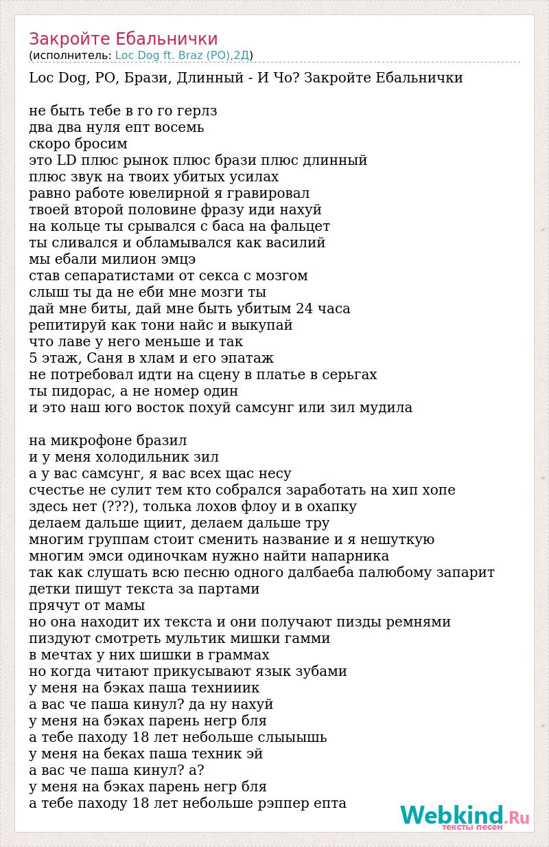 Loc Dog, РО, Брази, Длинный - И Чо? Закройте Ебальнички не быть тебе в го го герлз два два нуля епт восемь скоро бросим это LD плюс рынок плюс брази плюс длинный плюс звук на твоих убитых усилах равно работе ювелирной я гравировал твоей второй половине фразу иди нахуй на кольце ты срывался с баса на фальцет ты сливался и обламывался как василий мы ебали милион эмцэ став сепаратистами от секса с мозгом слыш ты да не еби мне мозги ты дай мне биты, дай мне быть убитым 24 часа репитируй как тони найс и выкупай что лаве у него меньше и так 5 этаж, Саня в хлам и его эпатаж не потребовал идти на сцену в платье в серьгах ты пидорас, а не номер один и это наш юго восток похуй самсунг или зил мудила на микрофоне бразил и у меня холодильник зил а у вас самсунг, я вас всех щас несу счестье не сулит тем кто собрался заработать на хип хопе здесь нет (???), толька лохов флоу и в охапку делаем дальше щиит, делаем дальше тру многим группам стоит сменить название и я нешуткую многим эмси одиночкам нужно найти напарника так как слушать всю песню одного далбаеба палюбому запарит детки пишут текста за партами прячут от мамы но она находит их текста и они получают пизды ремнями пиздуют смотреть мультик мишки гамми в мечтах у них шишки в граммах но когда читают прикусывают язык зубами у меня на бэках паша технииик а вас че паша кинул? да ну нахуй у меня на бэках парень негр бля а тебе паходу 18 лет небольше слыыышь у меня на беках паша техник эй а вас че паша кинул? а? у меня на бэках парень негр бля а тебе паходу 18 лет небольше рэппер епта