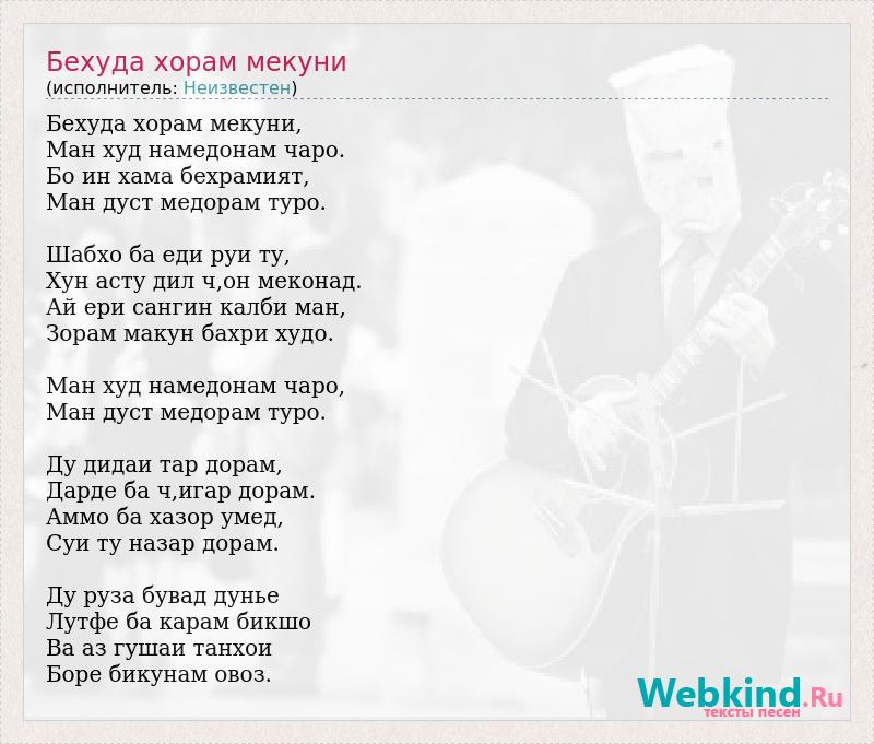 Бехуда хорам мекуни, Ман худ намедонам чаро. Бо ин хама бехрамият, Ман дуст медорам туро. Шабхо ба еди руи ту, Хун асту дил ч,он меконад. Ай ери сангин калби ман, Зорам макун бахри худо. Ман худ намедонам чаро, Ман дуст медорам туро. Ду дидаи тар дорам, Дарде ба ч,игар дорам. Аммо ба хазор умед, Суи ту назар дорам. Ду руза бувад дунье Лутфе ба карам бикшо Ва аз гушаи танхои Боре бикунам овоз.