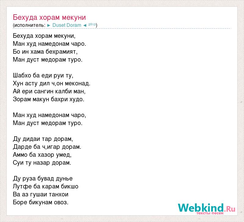 Бехуда хорам мекуни, Ман худ намедонам чаро. Бо ин хама бехрамият, Ман дуст медорам туро. Шабхо ба еди руи ту, Хун асту дил ч,он меконад. Ай ери сангин калби ман, Зорам макун бахри худо. Ман худ намедонам чаро, Ман дуст медорам туро. Ду дидаи тар дорам, Дарде ба ч,игар дорам. Аммо ба хазор умед, Суи ту назар дорам. Ду руза бувад дунье Лутфе ба карам бикшо Ва аз гушаи танхои Боре бикунам овоз.