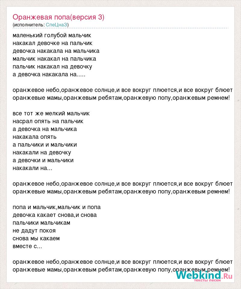 маленький голубой мальчик накакал девочке на пальчик девочка накакала на мальчика мальчик накакал на пальчика пальчик накакал на девочку а девочка накакала на..... оранжевое небо,оранжевое солнце,и все вокруг плюется,и все вокруг блюет оранжевые мамы,оранжевым ребятам,оранжевую попу,оранжевым ремнем! все тот же мелкий мальчик насрал опять на пальчик а девочка на мальчика накакала опять а пальчики и мальчики накакали на девочку а девочки и мальчики накакали на... оранжевое небо,оранжевое солнце,и все вокруг плюется,и все вокруг блюет оранжевые мамы,оранжевым ребятам,оранжевую попу,оранжевым ремнем! попа и мальчик,мальчик и попа девочка какает снова,и снова пальчики мальчикам не дадут покоя снова мы какаем вместе с... оранжевое небо,оранжевое солнце,и все вокруг плюется,и все вокруг блюет оранжевые мамы,оранжевым ребятам,оранжевую попу,оранжевым ремнем!