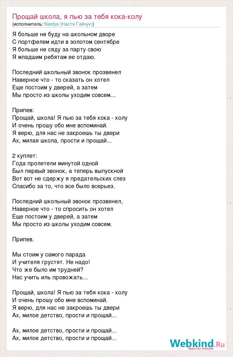 Я больше не буду на школьном дворе С портфелем идти в золотом сентябре Я больше не сяду за парту свою Я младшим ребятам ее отдаю. Последний школьный звонок прозвенел Наверное что - то сказать он хотел Еще постоим у дверей, а затем Мы просто из школы уходим совсем... Припев: Прощай, школа! Я пью за тебя кока - колу И очень прошу обо мне вспоминай. Я верю, для нас не закроешь ты двери Ах, милая школа, прости и прощай... 2 куплет: Года пролетели минутой одной Был первый звонок, а теперь выпускной Вот вот не сдержу я предательских слез Спасибо за то, что все было всерьез. Последний школьный звонок прозвенел, Наверное что - то спросить он хотел Еще постоим у дверей, а затем Мы просто из школы уходим совсем. Припев. Мы стоим у самого парада И учителя грустят. Не надо! Что же было им трудней? Нас учить иль провожать... Прощай, школа! Я пью за тебя кока - колу И очень прошу обо мне вспоминай. Я верю, для нас не закроешь ты двери Ах, милое детство, прости и прощай... Ах, милое детство, прости и прощай... Ах, милое детство, прости и прощай...