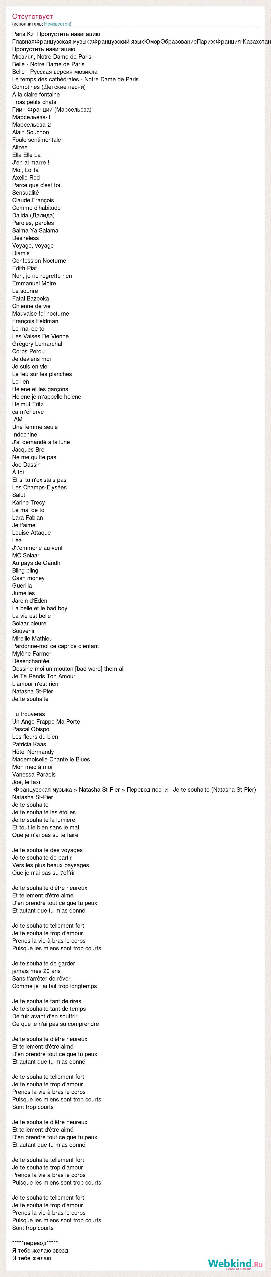 Paris.Kz Пропустить навигацию ГлавнаяФранцузская музыкаФранцузский языкЮморОбразованиеПарижФранция-Казахстан Пропустить навигацию Мюзикл, Notre Dame de Paris Belle - Notre Dame de Paris Belle - Русская версия мюзикла Le temps des cathédrales - Notre Dame de Paris Comptines (Детские песни) À la claire fontaine Trois petits chats Гимн Франции (Марсельеза) Марсельеза-1 Марсельеза-2 Alain Souchon Foule sentimentale Alizée Ella Elle La J'en ai marre ! Moi, Lolita Axelle Red Parce que c'est toi Sensualité Claude François Comme d'habitude Dalida (Далида) Paroles, paroles Salma Ya Salama Desireless Voyage, voyage Diam's Confession Nocturne Edith Piaf Non, je ne regrette rien Emmanuel Moire Le sourire Fatal Bazooka Chienne de vie Mauvaise foi nocturne François Feldman Le mal de toi Les Valses De Vienne Grégory Lemarchal Corps Perdu Je deviens moi Je suis en vie Le feu sur les planches Le lien Helene et les garçons Helene je m'appelle helene Helmut Fritz ça m'énerve IAM Une femme seule Indochine J'ai demandé à la lune Jacques Brel Ne me quitte pas Joe Dassin À toi Et si tu n'existais pas Les Champs-Elysées Salut Karine Trecy Le mal de toi Lara Fabian Je t'aime Louise Attaque Léa J't'emmene au vent MC Solaar Au pays de Gandhi Bling bling Cash money Guerilla Jumelles Jardin d'Eden La belle et le bad boy La vie est belle Solaar pleure Souvenir Mireille Mathieu Pardonne-moi ce caprice d'enfant Mylène Farmer Désenchantée Dessine-moi un mouton [bad word] them all Je Te Rends Ton Amour L'amour n'est rien Natasha St-Pier Je te souhaite Tu trouveras Un Ange Frappe Ma Porte Pascal Obispo Les fleurs du bien Patricia Kaas Hôtel Normandy Mademoiselle Chante le Blues Mon mec à moi Vanessa Paradis Joe, le taxi Французская музыка > Natasha St-Pier > Перевод песни - Je te souhaite (Natasha St-Pier) Natasha St-Pier Je te souhaite Je te souhaite les étoiles Je te souhaite la lumière Et tout le bien sans le mal Que je n'ai pas su te faire Je te souhaite des voyages Je te souhaite de partir Vers les plus beaux paysages Que je n'ai pas su t'offrir Je te souhaite d'être heureux Et tellement d'être aimé D'en prendre tout ce que tu peux Et autant que tu m'as donné Je te souhaite tellement fort Je te souhaite trop d'amour Prends la vie à bras le corps Puisque les miens sont trop courts Je te souhaite de garder jamais mes 20 ans Sans t'arrêter de rêver Comme je l'ai fait trop longtemps Je te souhaite tant de rires Je te souhaite tant de temps De fuir avant d'en souffrir Ce que je n'ai pas su comprendre Je te souhaite d'être heureux Et tellement d'être aimé D'en prendre tout ce que tu peux Et autant que tu m'as donné Je te souhaite tellement fort Je te souhaite trop d'amour Prends la vie à bras le corps Puisque les miens sont trop courts Sont trop courts Je te souhaite d'être heureux Et tellement d'être aimé D'en prendre tout ce que tu peux Et autant que tu m'as donné Je te souhaite tellement fort Je te souhaite trop d'amour Prends la vie à bras le corps Puisque les miens sont trop courts Je te souhaite tellement fort Je te souhaite trop d'amour Prends la vie à bras le corps Puisque les miens sont trop courts Sont trop courts *****перевод***** Я тебе желаю звезд Я тебе желаю