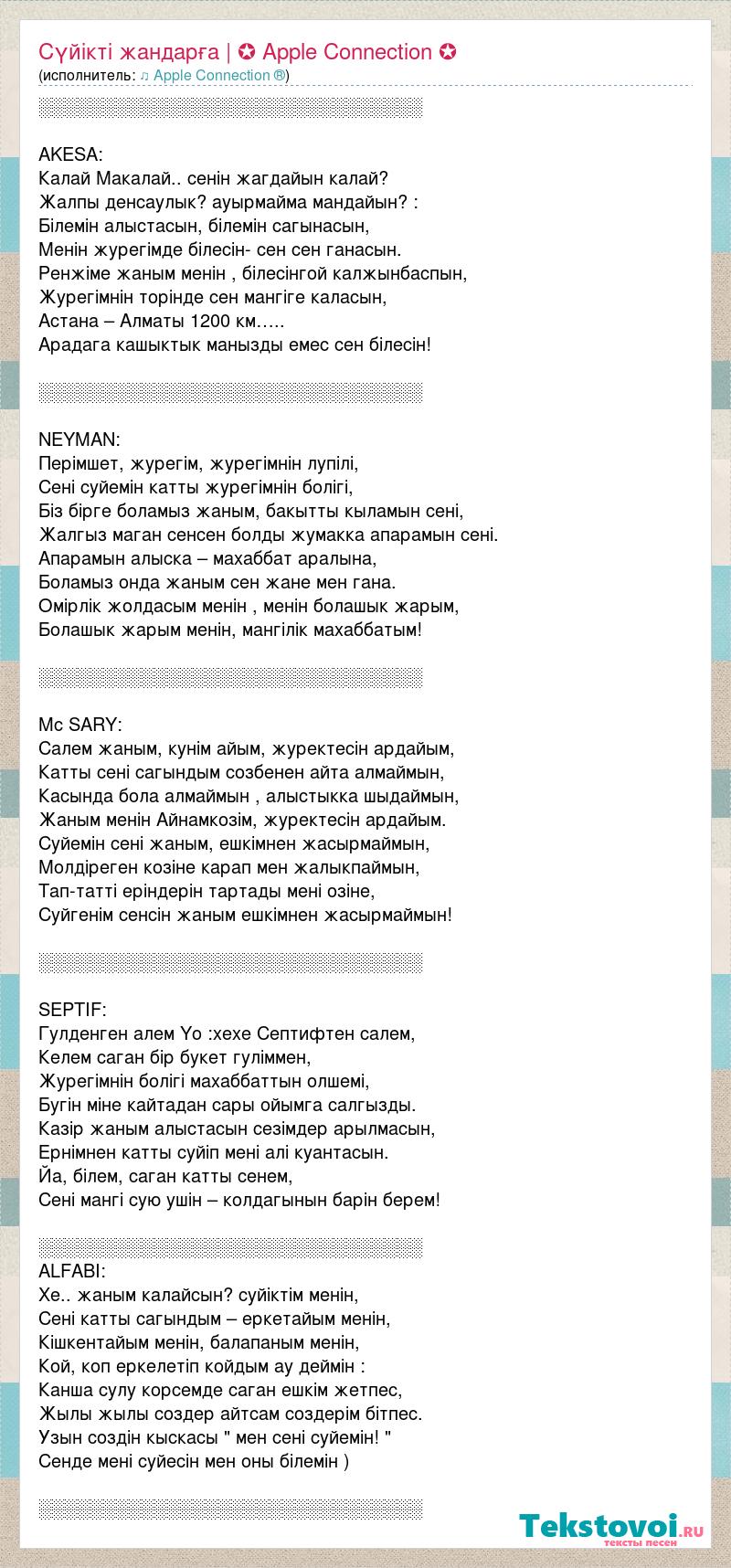 ░░░░░░░░░░░░░░░░░░░░░░░░░░░░░░ AKESA: Калай Макалай.. сенін жагдайын калай? Жалпы денсаулык? ауырмайма мандайын? : Білемін алыстасын, білемін сагынасын, Менін журегімде білесін- сен сен ганасын. Ренжіме жаным менін , білесінгой калжынбаспын, Журегімнін торінде сен мангіге каласын, Астана – Алматы 1200 км….. Арадага кашыктык манызды емес сен білесін! ░░░░░░░░░░░░░░░░░░░░░░░░░░░░░░ NEYMAN: Перімшет, журегім, журегімнін лупілі, Сені суйемін катты журегімнін болігі, Біз бірге боламыз жаным, бакытты кыламын сені, Жалгыз маган сенсен болды жумакка апарамын сені. Апарамын алыска – махаббат аралына, Боламыз онда жаным сен жане мен гана. Омірлік жолдасым менін , менін болашык жарым, Болашык жарым менін, мангілік махаббатым! ░░░░░░░░░░░░░░░░░░░░░░░░░░░░░░ Mc SARY: Салем жаным, кунім айым, журектесін ардайым, Катты сені сагындым созбенен айта алмаймын, Касында бола алмаймын , алыстыкка шыдаймын, Жаным менін Айнамкозім, журектесін ардайым. Суйемін сені жаным, ешкімнен жасырмаймын, Молдіреген козіне карап мен жалыкпаймын, Тап-татті еріндерін тартады менi озіне, Суйгенім сенсін жаным ешкімнен жасырмаймын! ░░░░░░░░░░░░░░░░░░░░░░░░░░░░░░ SEPTIF: Гулденген алем Yo :хехе Септифтен салем, Келем саган бір букет гуліммен, Журегімнін болігі махаббаттын олшемі, Бугін міне кайтадан сары ойымга салгызды. Казір жаным алыстасын сезімдер арылмасын, Ернімнен катты суйіп мені алі куантасын. Йа, білем, саган катты сенем, Сені мангі сую ушін – колдагынын барін берем! ░░░░░░░░░░░░░░░░░░░░░░░░░░░░░░ ALFABI: Хе.. жаным калайсын? суйіктім менін, Сені катты сагындым – еркетайым менін, Кішкентайым менін, балапаным менін, Кой, коп еркелетіп койдым ау деймін : Канша сулу корсемде саган ешкім жетпес, Жылы жылы создер айтсам создерім бітпес. Узын создін кыскасы " мен сені суйемін! " Сенде мені суйесін мен оны білемін ) ░░░░░░░░░░░░░░░░░░░░░░░░░░░░░░