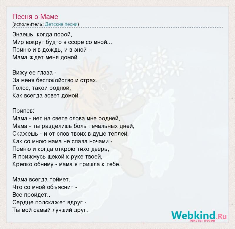 Знаешь, когда порой, Мир вокруг будто в ссоре со мной... Помню и в дождь, и в зной - Мама ждет меня домой. Вижу ее глаза - За меня беспокойство и страх. Голос, такой родной, Как всегда зовет домой. Припев: Мама - нет на свете слова мне родней, Мама - ты разделишь боль печальных дней, Скажешь - и от слов твоих в душе теплей. Как со мною мама не спала ночами - Помню и когда открою тихо дверь, Я прижмусь щекой к руке твоей, Крепко обниму - мама я пришла к тебе. Мама всегда поймет. Что со мной объяснит - Все пройдет.. Сердце подскажет вдруг - Ты мой самый лучший друг.