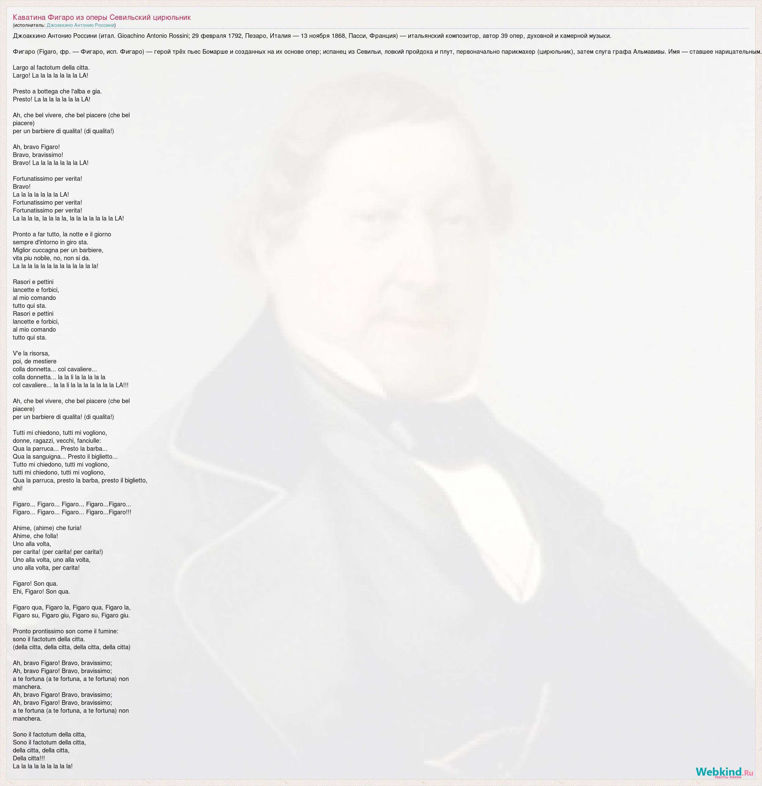 Джоаккино Антонио Россини (итал. Gioachino Antonio Rossini; 29 февраля 1792, Пезаро, Италия — 13 ноября 1868, Пасси, Франция) — итальянский композитор, автор 39 опер, духовной и камерной музыки. Фигаро (Figaro, фр. — Фигаро́, исп. Фи́гаро) — герой трёх пьес Бомарше и созданных на их основе опер; испанец из Севильи, ловкий пройдоха и плут, первоначально парикмахер (цирюльник), затем слуга графа Альмавивы. Имя — ставшее нарицательным. Largo al factotum della citta. Largo! La la la la la la la LA! Presto a bottega che l'alba e gia. Presto! La la la la la la la LA! Ah, che bel vivere, che bel piacere (che bel piacere) per un barbiere di qualita! (di qualita!) Ah, bravo Figaro! Bravo, bravissimo! Bravo! La la la la la la la LA! Fortunatissimo per verita! Bravo! La la la la la la la LA! Fortunatissimo per verita! Fortunatissimo per verita! La la la la, la la la la, la la la la la la la LA! Pronto a far tutto, la notte e il giorno sempre d'intorno in giro sta. Miglior cuccagna per un barbiere, vita piu nobile, no, non si da. La la la la la la la la la la la la la! Rasori e pettini lancette e forbici, al mio comando tutto qui sta. Rasori e pettini lancette e forbici, al mio comando tutto qui sta. V'e la risorsa, poi, de mestiere colla donnetta... col cavaliere... colla donnetta... la la li la la la la la col cavaliere... la la li la la la la la la la LA!!! Ah, che bel vivere, che bel piacere (che bel piacere) per un barbiere di qualita! (di qualita!) Tutti mi chiedono, tutti mi vogliono, donne, ragazzi, vecchi, fanciulle: Qua la parruca... Presto la barba... Qua la sanguigna... Presto il biglietto... Tutto mi chiedono, tutti mi vogliono, tutti mi chiedono, tutti mi vogliono, Qua la parruca, presto la barba, presto il biglietto, ehi! Figaro... Figaro... Figaro... Figaro...Figaro... Figaro... Figaro... Figaro... Figaro...Figaro!!! Ahime, (ahime) che furia! Ahime, che folla! Uno alla volta, per carita! (per carita! per carita!) Uno alla volta, uno alla volta, uno alla volta, per carita! Figaro! Son qua. Ehi, Figaro! Son qua. Figaro qua, Figaro la, Figaro qua, Figaro la, Figaro su, Figaro giu, Figaro su, Figaro giu. Pronto prontissimo son come il fumine: sono il factotum della citta. (della citta, della citta, della citta, della citta) Ah, bravo Figaro! Bravo, bravissimo; Ah, bravo Figaro! Bravo, bravissimo; a te fortuna (a te fortuna, a te fortuna) non manchera. Ah, bravo Figaro! Bravo, bravissimo; Ah, bravo Figaro! Bravo, bravissimo; a te fortuna (a te fortuna, a te fortuna) non manchera. Sono il factotum della citta, Sono il factotum della citta, della citta, della citta, Della citta!!! La la la la la la la la la!