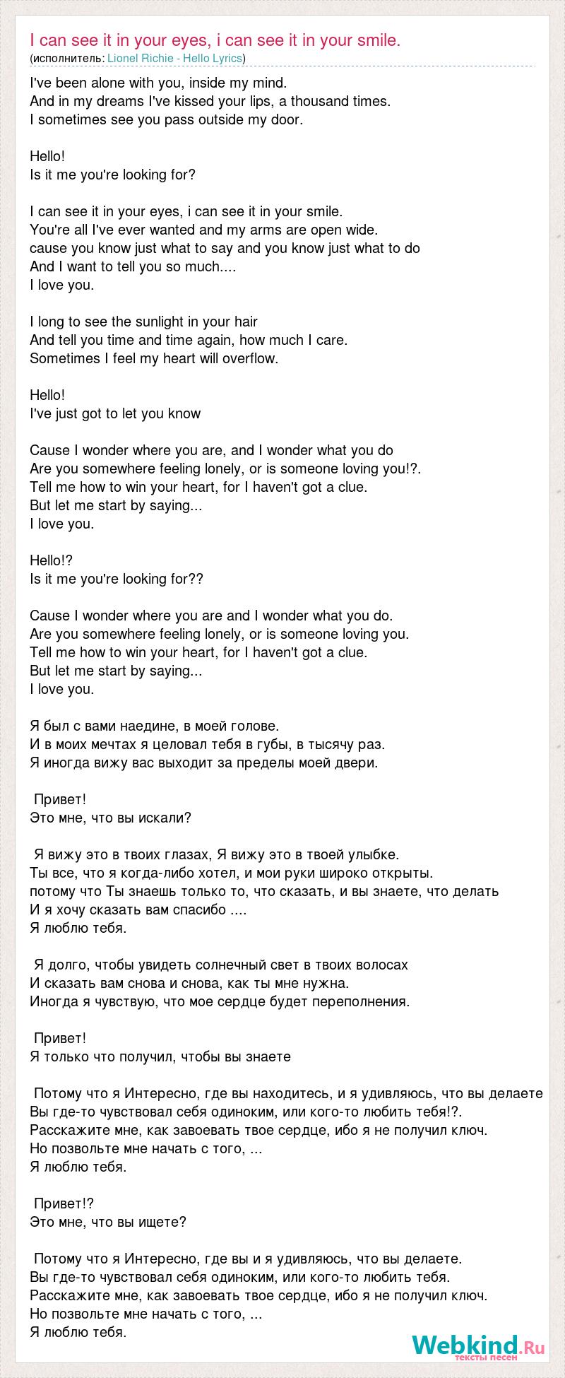 Главная→Исполнители→Lionel Richie - Hello Lyrics→I can see it in your eyes, i can see it in your smile.