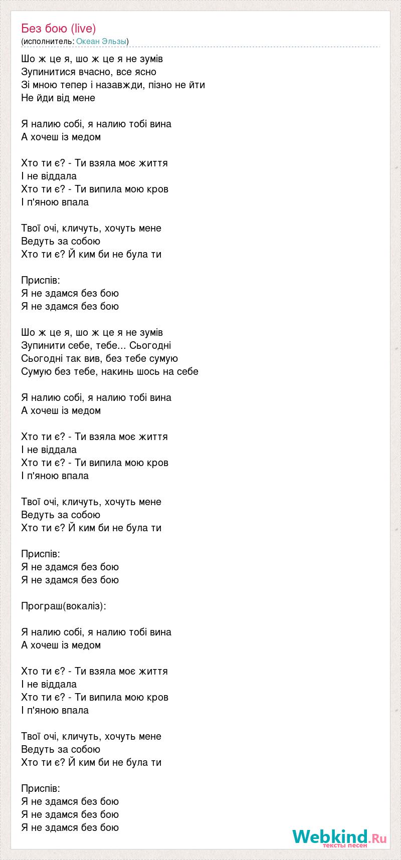 Шо ж це я, шо ж це я не зумів Зупинитися вчасно, все ясно Зі мною тепер і назавжди, пізно не йти Не йди від мене Я налию собі, я налию тобі вина А хочеш із медом Хто ти є? - Ти взяла моє життя І не віддала Хто ти є? - Ти випила мою кров І п'яною впала Твої очі, кличуть, хочуть мене Ведуть за собою Хто ти є? Й ким би не була ти Приспів: Я не здамся без бою Я не здамся без бою Шо ж це я, шо ж це я не зумів Зупинити себе, тебе... Сьогодні Сьогодні так вив, без тебе сумую Сумую без тебе, накинь шось на себе Я налию собі, я налию тобі вина А хочеш із медом Хто ти є? - Ти взяла моє життя І не віддала Хто ти є? - Ти випила мою кров І п'яною впала Твої очі, кличуть, хочуть мене Ведуть за собою Хто ти є? Й ким би не була ти Приспів: Я не здамся без бою Я не здамся без бою Програш(вокаліз): Я налию собі, я налию тобі вина А хочеш із медом Хто ти є? - Ти взяла моє життя І не віддала Хто ти є? - Ти випила мою кров І п'яною впала Твої очі, кличуть, хочуть мене Ведуть за собою Хто ти є? Й ким би не була ти Приспів: Я не здамся без бою Я не здамся без бою Я не здамся без бою