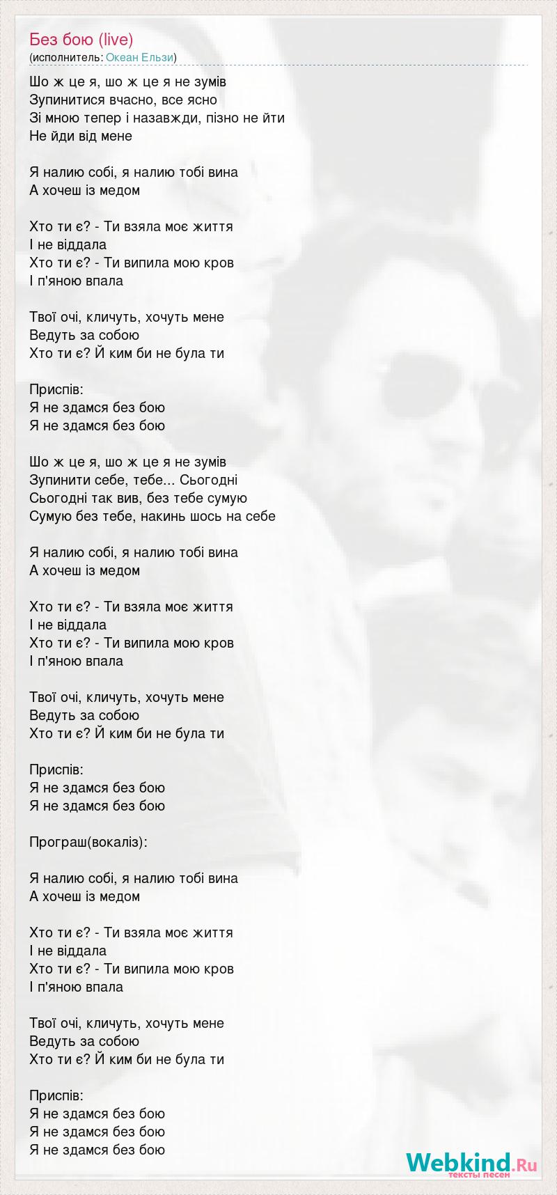 Шо ж це я, шо ж це я не зумів Зупинитися вчасно, все ясно Зі мною тепер і назавжди, пізно не йти Не йди від мене Я налию собі, я налию тобі вина А хочеш із медом Хто ти є? - Ти взяла моє життя І не віддала Хто ти є? - Ти випила мою кров І п'яною впала Твої очі, кличуть, хочуть мене Ведуть за собою Хто ти є? Й ким би не була ти Приспів: Я не здамся без бою Я не здамся без бою Шо ж це я, шо ж це я не зумів Зупинити себе, тебе... Сьогодні Сьогодні так вив, без тебе сумую Сумую без тебе, накинь шось на себе Я налию собі, я налию тобі вина А хочеш із медом Хто ти є? - Ти взяла моє життя І не віддала Хто ти є? - Ти випила мою кров І п'яною впала Твої очі, кличуть, хочуть мене Ведуть за собою Хто ти є? Й ким би не була ти Приспів: Я не здамся без бою Я не здамся без бою Програш(вокаліз): Я налию собі, я налию тобі вина А хочеш із медом Хто ти є? - Ти взяла моє життя І не віддала Хто ти є? - Ти випила мою кров І п'яною впала Твої очі, кличуть, хочуть мене Ведуть за собою Хто ти є? Й ким би не була ти Приспів: Я не здамся без бою Я не здамся без бою Я не здамся без бою