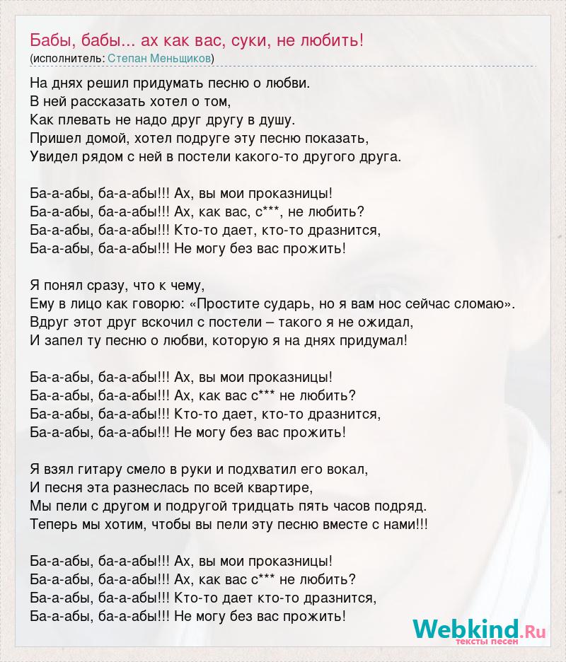 На днях решил придумать песню о любви. В ней рассказать хотел о том, Как плевать не надо друг другу в душу. Пришел домой, хотел подруге эту песню показать, Увидел рядом с ней в постели какого-то другого друга. Ба-а-абы, ба-а-абы!!! Ах, вы мои проказницы! Ба-а-абы, ба-а-абы!!! Ах, как вас, с***, не любить? Ба-а-абы, ба-а-абы!!! Кто-то дает, кто-то дразнится, Ба-а-абы, ба-а-абы!!! Не могу без вас прожить! Я понял сразу, что к чему, Ему в лицо как говорю: «Простите сударь, но я вам нос сейчас сломаю». Вдруг этот друг вскочил с постели – такого я не ожидал, И запел ту песню о любви, которую я на днях придумал! Ба-а-абы, ба-а-абы!!! Ах, вы мои проказницы! Ба-а-абы, ба-а-абы!!! Ах, как вас с*** не любить? Ба-а-абы, ба-а-абы!!! Кто-то дает, кто-то дразнится, Ба-а-абы, ба-а-абы!!! Не могу без вас прожить! Я взял гитару смело в руки и подхватил его вокал, И песня эта разнеслась по всей квартире, Мы пели с другом и подругой тридцать пять часов подряд. Теперь мы хотим, чтобы вы пели эту песню вместе с нами!!! Ба-а-абы, ба-а-абы!!! Ах, вы мои проказницы! Ба-а-абы, ба-а-абы!!! Ах, как вас с*** не любить? Ба-а-абы, ба-а-абы!!! Кто-то дает кто-то дразнится, Ба-а-абы, ба-а-абы!!! Не могу без вас прожить!