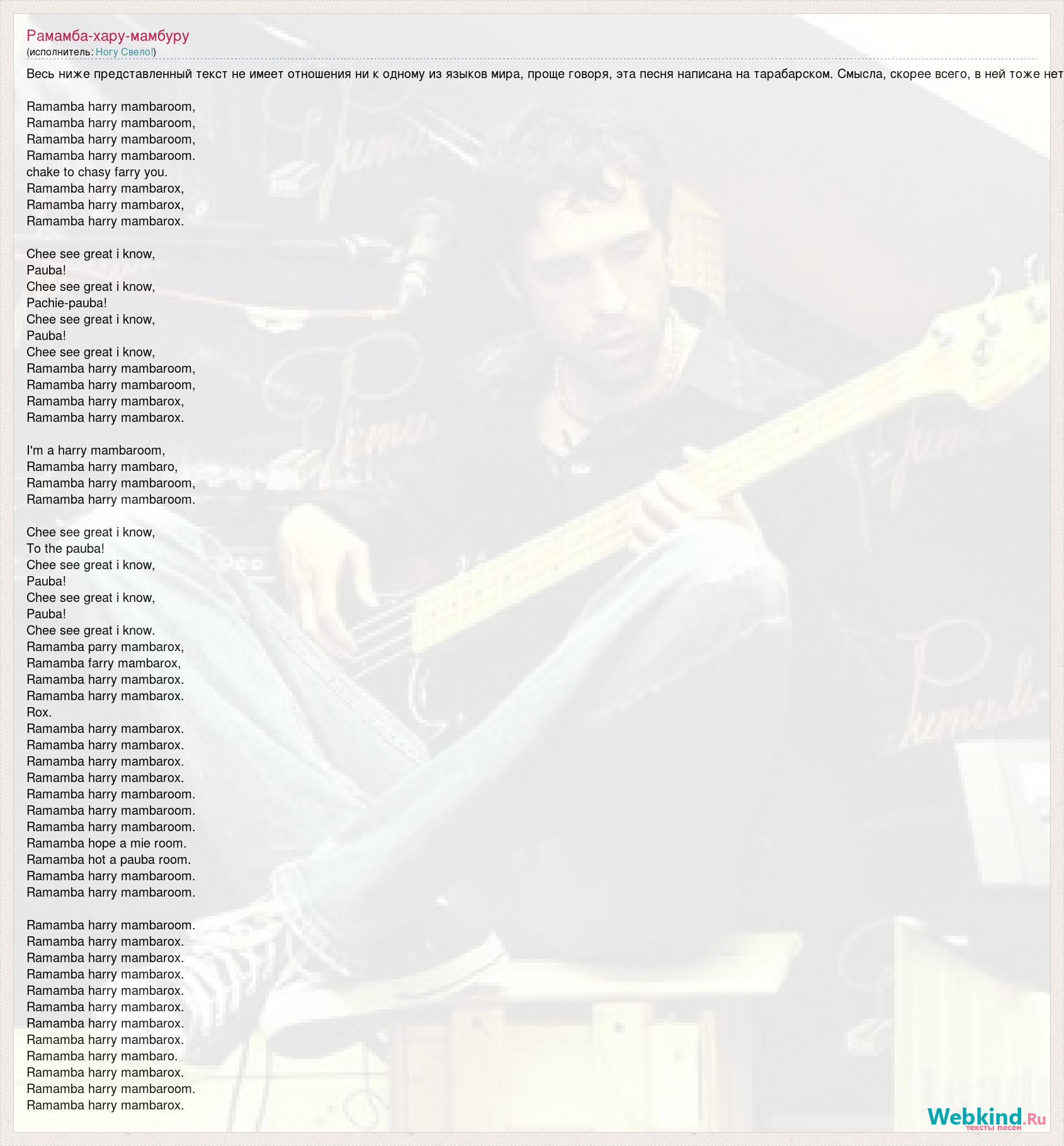Весь ниже представленный текст не имеет отношения ни к одному из языков мира, проще говоря, эта песня написана на тарабарском. Смысла, скорее всего, в ней тоже нет Ramamba harry mambaroom, Ramamba harry mambaroom, Ramamba harry mambaroom, Ramamba harry mambaroom. chake to chasy farry you. Ramamba harry mambarox, Ramamba harry mambarox, Ramamba harry mambarox. Chee see great i know, Pauba! Chee see great i know, Pachie-pauba! Chee see great i know, Pauba! Chee see great i know, Ramamba harry mambaroom, Ramamba harry mambaroom, Ramamba harry mambarox, Ramamba harry mambarox. I'm a harry mambaroom, Ramamba harry mambaro, Ramamba harry mambaroom, Ramamba harry mambaroom. Chee see great i know, To the pauba! Chee see great i know, Pauba! Chee see great i know, Pauba! Chee see great i know. Ramamba parry mambarox, Ramamba farry mambarox, Ramamba harry mambarox. Ramamba harry mambarox. Rox. Ramamba harry mambarox. Ramamba harry mambarox. Ramamba harry mambarox. Ramamba harry mambarox. Ramamba harry mambaroom. Ramamba harry mambaroom. Ramamba harry mambaroom. Ramamba hope a mie room. Ramamba hot a pauba room. Ramamba harry mambaroom. Ramamba harry mambaroom. Ramamba harry mambaroom. Ramamba harry mambarox. Ramamba harry mambarox. Ramamba harry mambarox. Ramamba harry mambarox. Ramamba harry mambarox. Ramamba harry mambarox. Ramamba harry mambarox. Ramamba harry mambaro. Ramamba harry mambarox. Ramamba harry mambaroom. Ramamba harry mambarox.