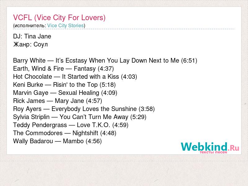 DJ: Tina Jane Жанр: Соул Barry White — It’s Ecstasy When You Lay Down Next to Me (6:51) Earth, Wind & Fire — Fantasy (4:37) Hot Chocolate — It Started with a Kiss (4:03) Keni Burke — Risin' to the Top (5:18) Marvin Gaye — Sexual Healing (4:09) Rick James — Mary Jane (4:57) Roy Ayers — Everybody Loves the Sunshine (3:58) Sylvia Striplin — You Can’t Turn Me Away (5:29) Teddy Pendergrass — Love T.K.O. (4:59) The Commodores — Nightshift (4:48) Wally Badarou — Mambo (4:56)