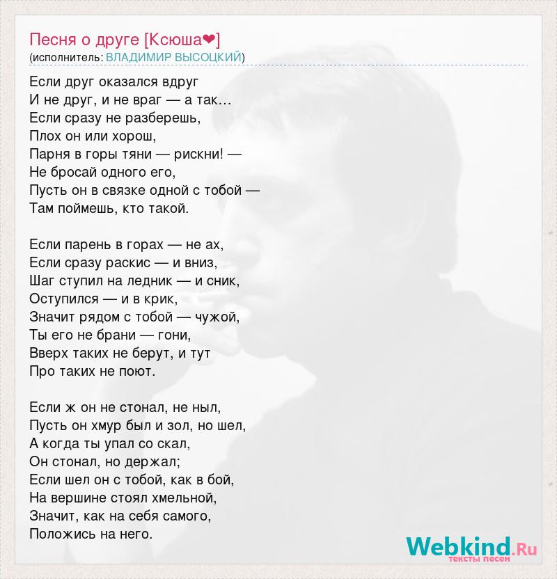Если друг оказался вдруг И не друг, и не враг — а так… Если сразу не разберешь, Плох он или хорош, Парня в горы тяни — рискни! — Не бросай одного его, Пусть он в связке одной с тобой — Там поймешь, кто такой. Если парень в горах — не ах, Если сразу раскис — и вниз, Шаг ступил на ледник — и сник, Оступился — и в крик, Значит рядом с тобой — чужой, Ты его не брани — гони, Вверх таких не берут, и тут Про таких не поют. Если ж он не стонал, не ныл, Пусть он хмур был и зол, но шел, А когда ты упал со скал, Он стонал, но держал; Если шел он с тобой, как в бой, На вершине стоял хмельной, Значит, как на себя самого, Положись на него.