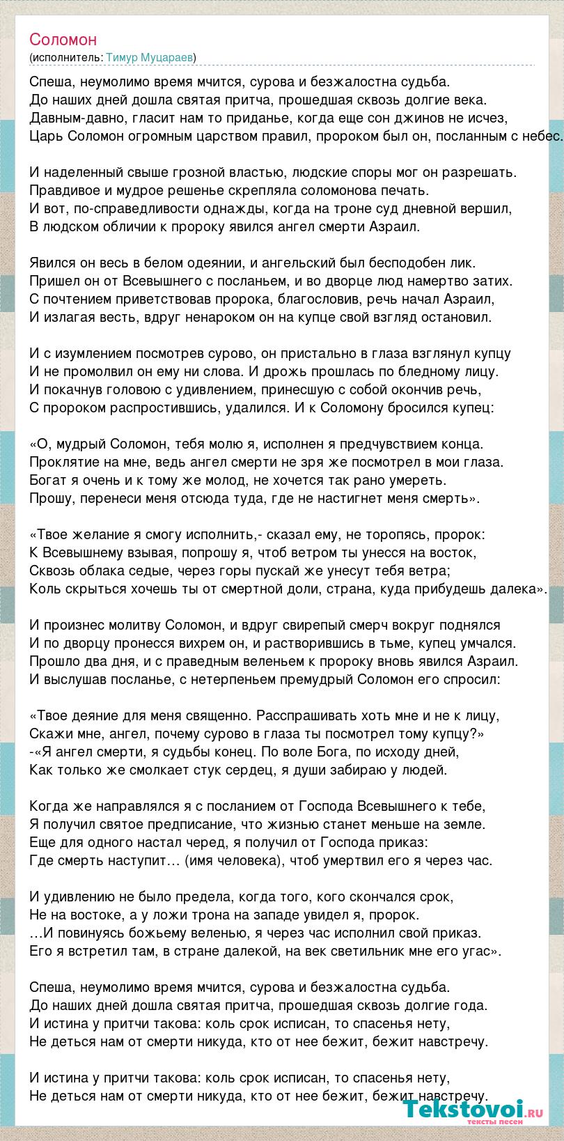 Спеша, неумолимо время мчится, сурова и безжалостна судьба. До наших дней дошла святая притча, прошедшая сквозь долгие века. Давным-давно, гласит нам то приданье, когда еще сон джинов не исчез, Царь Соломон огромным царством правил, пророком был он, посланным с небес. И наделенный свыше грозной властью, людские споры мог он разрешать. Правдивое и мудрое решенье скрепляла соломонова печать. И вот, по-справедливости однажды, когда на троне суд дневной вершил, В людском обличии к пророку явился ангел смерти Азраил. Явился он весь в белом одеянии, и ангельский был бесподобен лик. Пришел он от Всевышнего с посланьем, и во дворце люд намертво затих. С почтением приветствовав пророка, благословив, речь начал Азраил, И излагая весть, вдруг ненароком он на купце свой взгляд остановил. И с изумлением посмотрев сурово, он пристально в глаза взглянул купцу И не промолвил он ему ни слова. И дрожь прошлась по бледному лицу. И покачнув головою с удивлением, принесшую с собой окончив речь, С пророком распростившись, удалился. И к Соломону бросился купец: «О, мудрый Соломон, тебя молю я, исполнен я предчувствием конца. Проклятие на мне, ведь ангел смерти не зря же посмотрел в мои глаза. Богат я очень и к тому же молод, не хочется так рано умереть. Прошу, перенеси меня отсюда туда, где не настигнет меня смерть». «Твое желание я смогу исполнить,- сказал ему, не торопясь, пророк: К Всевышнему взывая, попрошу я, чтоб ветром ты унесся на восток, Сквозь облака седые, через горы пускай же унесут тебя ветра; Коль скрыться хочешь ты от смертной доли, страна, куда прибудешь далека». И произнес молитву Соломон, и вдруг свирепый смерч вокруг поднялся И по дворцу пронесся вихрем он, и растворившись в тьме, купец умчался. Прошло два дня, и с праведным веленьем к пророку вновь явился Азраил. И выслушав посланье, с нетерпеньем премудрый Соломон его спросил: «Твое деяние для меня священно. Расспрашивать хоть мне и не к лицу, Скажи мне, ангел, почему сурово в глаза ты посмотрел тому купцу?» -«Я ангел смерти, я судьбы конец. По воле Бога, по исходу дней, Как только же смолкает стук сердец, я души забираю у людей. Когда же направлялся я с посланием от Господа Всевышнего к тебе, Я получил святое предписание, что жизнью станет меньше на земле. Еще для одного настал черед, я получил от Господа приказ: Где смерть наступит… (имя человека), чтоб умертвил его я через час. И удивлению не было предела, когда того, кого скончался срок, Не на востоке, а у ложи трона на западе увидел я, пророк. …И повинуясь божьему веленью, я через час исполнил свой приказ. Его я встретил там, в стране далекой, на век светильник мне его угас». Спеша, неумолимо время мчится, сурова и безжалостна судьба. До наших дней дошла святая притча, прошедшая сквозь долгие года. И истина у притчи такова: коль срок исписан, то спасенья нету, Не деться нам от смерти никуда, кто от нее бежит, бежит навстречу. И истина у притчи такова: коль срок исписан, то спасенья нету, Не деться нам от смерти никуда, кто от нее бежит, бежит навстречу.