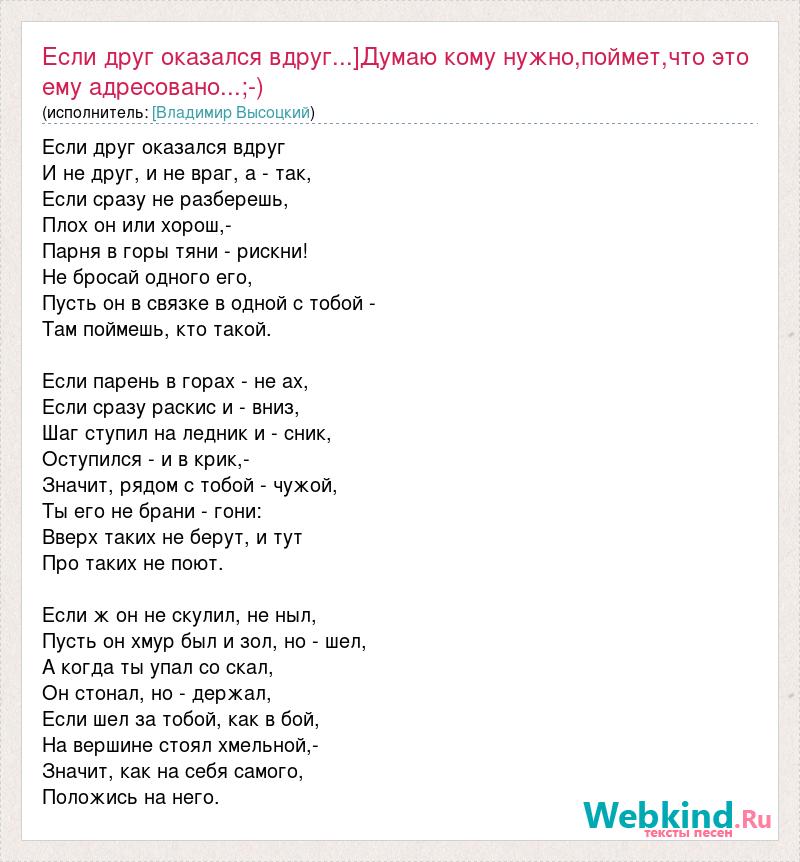 Главная→Исполнители→[Владимир Высоцкий→Если друг оказался вдруг...]Думаю кому нужно,поймет,что это ему адресовано...;-)