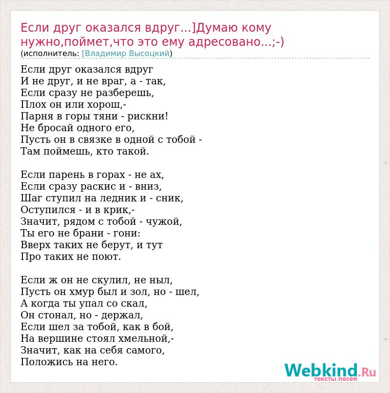 Главная→Исполнители→[Владимир Высоцкий→Если друг оказался вдруг...]Думаю кому нужно,поймет,что это ему адресовано...;-)