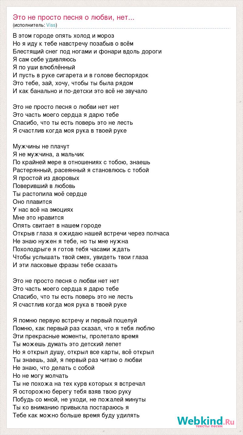 В этом городе опять холод и мороз Но я иду к тебе навстречу позабыв о всём Блестящий снег под ногами и фонари вдоль дороги Я сам себе удивляюсь Я по уши влюблённый И пусть в руке сигарета и в голове беспорядок Это тебе, зай, хочу, чтобы ты была рядом И как банально и по-детски это всё не звучало Это не просто песня о любви нет нет Это часть моего сердца я дарю тебе Спасибо, что ты есть поверь это не лесть Я счастлив когда моя рука в твоей руке Мужчины не плачут Я не мужчина, а мальчик По крайней мере в отношениях с тобою, знаешь Растерянный, расеянный я становлюсь с тобой Я простой из дворовых Поверивший в любовь Ты растопила моё сердце Оно плавится У нас всё на эмоциях Мне это нравится Опять свитает в нашем городе Открыв глаза я ожидаю нашей встречи через полчаса Не знаю нужен я тебе, но ты мне нужна Похолодрыге я готов тебя часами ждать Чтобы услышать твой смех, увидеть твои глаза И эти ласковые фразы тебе сказать Это не просто песня о любви нет нет Это часть моего сердца я дарю тебе Спасибо, что ты есть поверь это не лесть Я счастлив когда моя рука в твоей руке Я помню первую встречу и первый поцелуй Помню, как первый раз сказал, что я тебя люблю Эти прекрасные моменты, пролетало время Ты можешь думать это детский лепет Но я открыл душу, открыл все карты, всё открыл Ты знаешь, зай, я первый раз читаю о любви Не знаю, что делать с собой Но не могу молчать Ты не похожа на тех курв которых я встречал Я осторожно берегу тебя взяв твою руку Побудь со мной, не уходи, не пожалей минуты Ты ко вниманию привыкла постараюсь я Тебе как можно больше время буду удилять