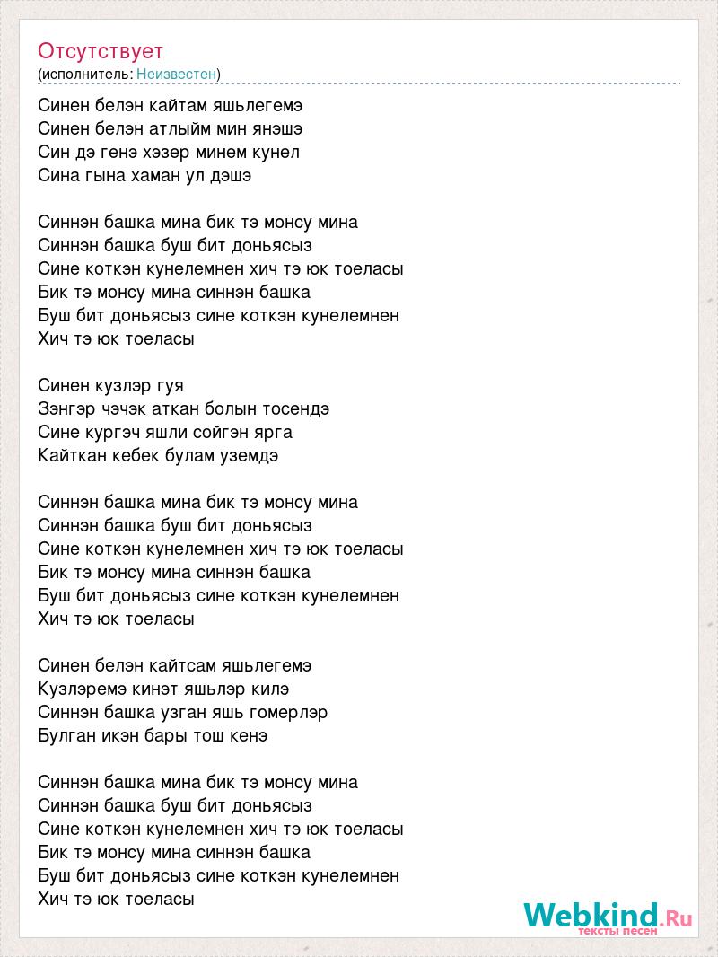 Синен белэн кайтам яшьлегемэ Синен белэн атлыйм мин янэшэ Син дэ генэ хэзер минем кунел Сина гына хаман ул дэшэ Синнэн башка мина бик тэ монсу мина Синнэн башка буш бит доньясыз Сине коткэн кунелемнен хич тэ юк тоеласы Бик тэ монсу мина синнэн башка Буш бит доньясыз сине коткэн кунелемнен Хич тэ юк тоеласы Синен кузлэр гуя Зэнгэр чэчэк аткан болын тосендэ Сине кургэч яшли сойгэн ярга Кайткан кебек булам уземдэ Синнэн башка мина бик тэ монсу мина Синнэн башка буш бит доньясыз Сине коткэн кунелемнен хич тэ юк тоеласы Бик тэ монсу мина синнэн башка Буш бит доньясыз сине коткэн кунелемнен Хич тэ юк тоеласы Синен белэн кайтсам яшьлегемэ Кузлэремэ кинэт яшьлэр килэ Синнэн башка узган яшь гомерлэр Булган икэн бары тош кенэ Синнэн башка мина бик тэ монсу мина Синнэн башка буш бит доньясыз Сине коткэн кунелемнен хич тэ юк тоеласы Бик тэ монсу мина синнэн башка Буш бит доньясыз сине коткэн кунелемнен Хич тэ юк тоеласы