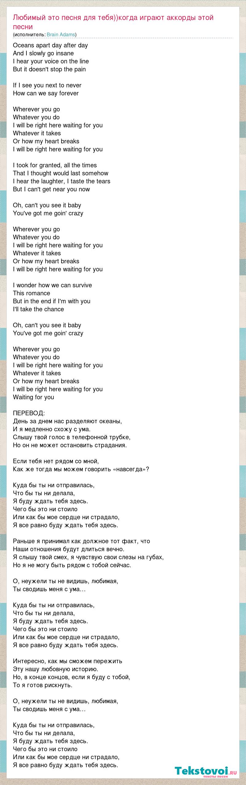 Oceans apart day after day And I slowly go insane I hear your voice on the line But it doesn't stop the pain If I see you next to never How can we say forever Wherever you go Whatever you do I will be right here waiting for you Whatever it takes Or how my heart breaks I will be right here waiting for you I took for granted, all the times That I thought would last somehow I hear the laughter, I taste the tears But I can't get near you now Oh, can't you see it baby You've got me goin' crazy Wherever you go Whatever you do I will be right here waiting for you Whatever it takes Or how my heart breaks I will be right here waiting for you I wonder how we can survive This romance But in the end if I'm with you I'll take the chance Oh, can't you see it baby You've got me goin' crazy Wherever you go Whatever you do I will be right here waiting for you Whatever it takes Or how my heart breaks I will be right here waiting for you Waiting for you ПЕРЕВОД: День за днем нас разделяют океаны, И я медленно схожу с ума. Слышу твой голос в телефонной трубке, Но он не может остановить страдания. Если тебя нет рядом со мной, Как же тогда мы можем говорить «навсегда»? Куда бы ты ни отправилась, Что бы ты ни делала, Я буду ждать тебя здесь. Чего бы это ни стоило Или как бы мое сердце ни страдало, Я все равно буду ждать тебя здесь. Раньше я принимал как должное тот факт, что Наши отношения будут длиться вечно. Я слышу твой смех, я чувствую свои слезы на губах, Но я не могу быть рядом с тобой сейчас. О, неужели ты не видишь, любимая, Ты сводишь меня с ума… Куда бы ты ни отправилась, Что бы ты ни делала, Я буду ждать тебя здесь. Чего бы это ни стоило Или как бы мое сердце ни страдало, Я все равно буду ждать тебя здесь. Интересно, как мы сможем пережить Эту нашу любовную историю. Но, в конце концов, если я буду с тобой, То я готов рискнуть. О, неужели ты не видишь, любимая, Ты сводишь меня с ума… Куда бы ты ни отправилась, Что бы ты ни делала, Я буду ждать тебя здесь. Чего бы это ни стоило Или как бы мое сердце ни страдало, Я все равно буду ждать тебя здесь.
