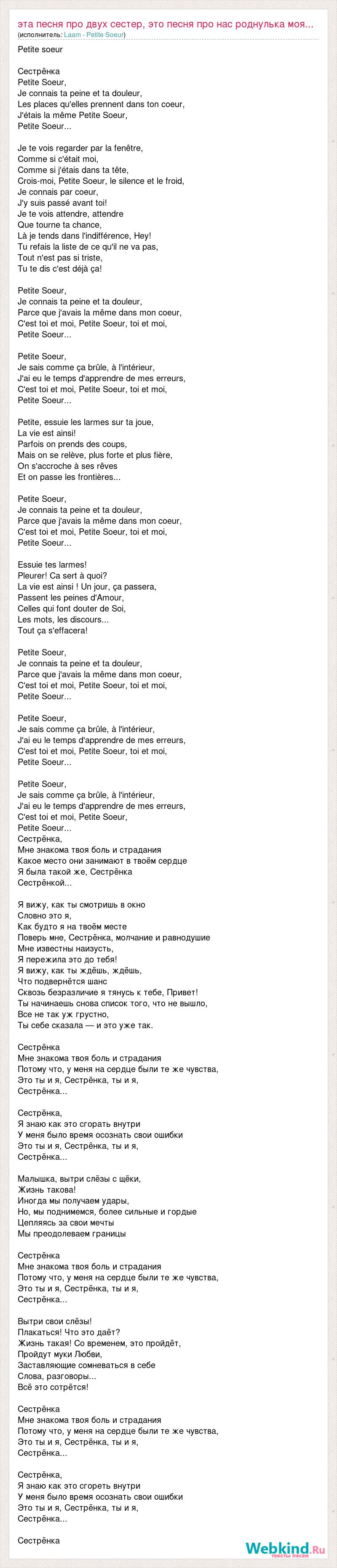 Petite soeur Сестрёнка Petite Soeur, Je connais ta peine et ta douleur, Les places qu'elles prennent dans ton coeur, J'étais la même Petite Soeur, Petite Soeur... Je te vois regarder par la fenêtre, Comme si c'était moi, Comme si j'étais dans ta tête, Crois-moi, Petite Soeur, le silence et le froid, Je connais par coeur, J'y suis passé avant toi! Je te vois attendre, attendre Que tourne ta chance, Là je tends dans l'indifférence, Hey! Tu refais la liste de ce qu'il ne va pas, Tout n'est pas si triste, Tu te dis c'est déjà ça! Petite Soeur, Je connais ta peine et ta douleur, Parce que j'avais la même dans mon coeur, C'est toi et moi, Petite Soeur, toi et moi, Petite Soeur... Petite Soeur, Je sais comme ça brûle, à l'intérieur, J'ai eu le temps d'apprendre de mes erreurs, C'est toi et moi, Petite Soeur, toi et moi, Petite Soeur... Petite, essuie les larmes sur ta joue, La vie est ainsi! Parfois on prends des coups, Mais on se relève, plus forte et plus fière, On s'accroche à ses rêves Et on passe les frontières... Petite Soeur, Je connais ta peine et ta douleur, Parce que j'avais la même dans mon coeur, C'est toi et moi, Petite Soeur, toi et moi, Petite Soeur... Essuie tes larmes! Pleurer! Ca sert à quoi? La vie est ainsi ! Un jour, ça passera, Passent les peines d'Amour, Celles qui font douter de Soi, Les mots, les discours... Tout ça s'effacera! Petite Soeur, Je connais ta peine et ta douleur, Parce que j'avais la même dans mon coeur, C'est toi et moi, Petite Soeur, toi et moi, Petite Soeur... Petite Soeur, Je sais comme ça brûle, à l'intérieur, J'ai eu le temps d'apprendre de mes erreurs, C'est toi et moi, Petite Soeur, toi et moi, Petite Soeur... Petite Soeur, Je sais comme ça brûle, à l'intérieur, J'ai eu le temps d'apprendre de mes erreurs, C'est toi et moi, Petite Soeur, Petite Soeur... Сестрёнка, Мне знакома твоя боль и страдания Какое место они занимают в твоём сердце Я была такой же, Сестрёнка Сестрёнкой... Я вижу, как ты смотришь в окно Словно это я, Как будто я на твоём месте Поверь мне, Сестрёнка, молчание и равнодушие Мне известны наизусть, Я пережила это до тебя! Я вижу, как ты ждёшь, ждёшь, Что подвернётся шанс Сквозь безразличие я тянусь к тебе, Привет! Ты начинаешь снова список того, что не вышло, Все не так уж грустно, Ты себе сказала — и это уже так. Сестрёнка Мне знакома твоя боль и страдания Потому что, у меня на сердце были те же чувства, Это ты и я, Сестрёнка, ты и я, Сестрёнка... Сестрёнка, Я знаю как это сгорать внутри У меня было время осознать свои ошибки Это ты и я, Сестрёнка, ты и я, Сестрёнка... Малышка, вытри слёзы с щёки, Жизнь такова! Иногда мы получаем удары, Но, мы поднимемся, более сильные и гордые Цепляясь за свои мечты Мы преодолеваем границы Сестрёнка Мне знакома твоя боль и страдания Потому что, у меня на сердце были те же чувства, Это ты и я, Сестрёнка, ты и я, Сестрёнка... Вытри свои слёзы! Плакаться! Что это даёт? Жизнь такая! Cо временем, это пройдёт, Пройдут муки Любви, Заставляющие сомневаться в себе Слова, разговоры... Всё это сотрётся! Сестрёнка Мне знакома твоя боль и страдания Потому что, у меня на сердце были те же чувства, Это ты и я, Сестрёнка, ты и я, Сестрёнка... Сестрёнка, Я знаю как это сгореть внутри У меня было время осознать свои ошибки Это ты и я, Сестрёнка, ты и я, Сестрёнка... Сестрёнка