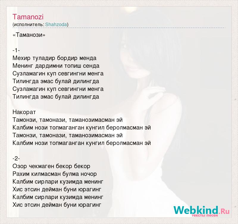 «Таманози» -1- Мехир туладир бордир менда Менинг дардимни топиш сенда Сузламагин куп севгингни менга Тилингда эмас булай дилингда Сузламагин куп севгингни менга Тилингда эмас булай дилингда Накорат Тамонзи, тамонази, таманозимасман эй Калбим нози топмаганган кунгил беролмасман эй Тамонзи, тамонази, таманозимасман эй Калбим нози топмаганган кунгил беролмасман эй -2- Озор чекмаген бекор бекор Рахим килмасман булма ночор Калбим сирлари кузимда менинг Хис этсин дейман буни юрагинг Калбим сирлари кузимда менинг Хис этсин дейман буни юрагинг