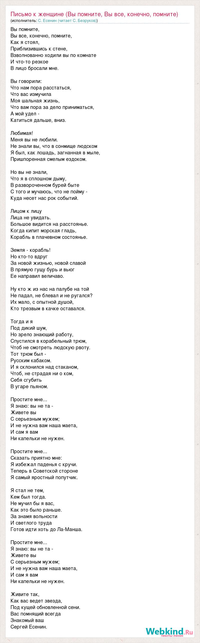 Вы помните, Вы все, конечно, помните, Как я стоял, Приблизившись к стене, Взволнованно ходили вы по комнате И что-то резкое В лицо бросали мне. Вы говорили: Что нам пора расстаться, Что вас измучила Моя шальная жизнь, Что вам пора за дело приниматься, А мой удел - Катиться дальше, вниз. Любимая! Меня вы не любили. Не знали вы, что в сонмище людском Я был, как лошадь, загнанная в мыле, Пришпоренная смелым ездоком. Но вы не знали, Что я в сплошном дыму, В развороченном бурей быте С того и мучаюсь, что не пойму - Куда несет нас рок событий. Лицом к лицу Лица не увидать. Большое видится на расстоянье. Когда кипит морская гладь, Корабль в плачевном состоянье. Земля - корабль! Но кто-то вдруг За новой жизнью, новой славой В прямую гущу бурь и вьюг Ее направил величаво. Ну кто ж из нас на палубе на той Не падал, не блевал и не ругался? Их мало, с опытной душой, Кто трезвым в качке оставался. Тогда и я Под дикий шум, Но зрело знающий работу, Спустился в корабельный трюм, Чтоб не смотреть людскую рвоту. Тот трюм был - Русским кабаком. И я склонился над стаканом, Чтоб, не страдая ни о ком, Себя сгубить В угаре пьяном. Простите мне... Я знаю: вы не та - Живете вы С серьезным мужем; И не нужна вам наша маета, И сам я вам Ни капельки не нужен. Простите мне... Сказать приятно мне: Я избежал паденья с кручи. Теперь в Советской стороне Я самый яростный попутчик. Я стал не тем, Кем был тогда. Не мучил бы я вас, Как это было раньше. За знамя вольности И светлого труда Готов идти хоть до Ла-Манша. Простите мне... Я знаю: вы не та - Живете вы С серьезным мужем; И не нужна вам наша маета, И сам я вам Ни капельки не нужен. Живите так, Как вас ведет звезда, Под кущей обновленной сени. Вас помнящий всегда Знакомый ваш Сергей Есенин.