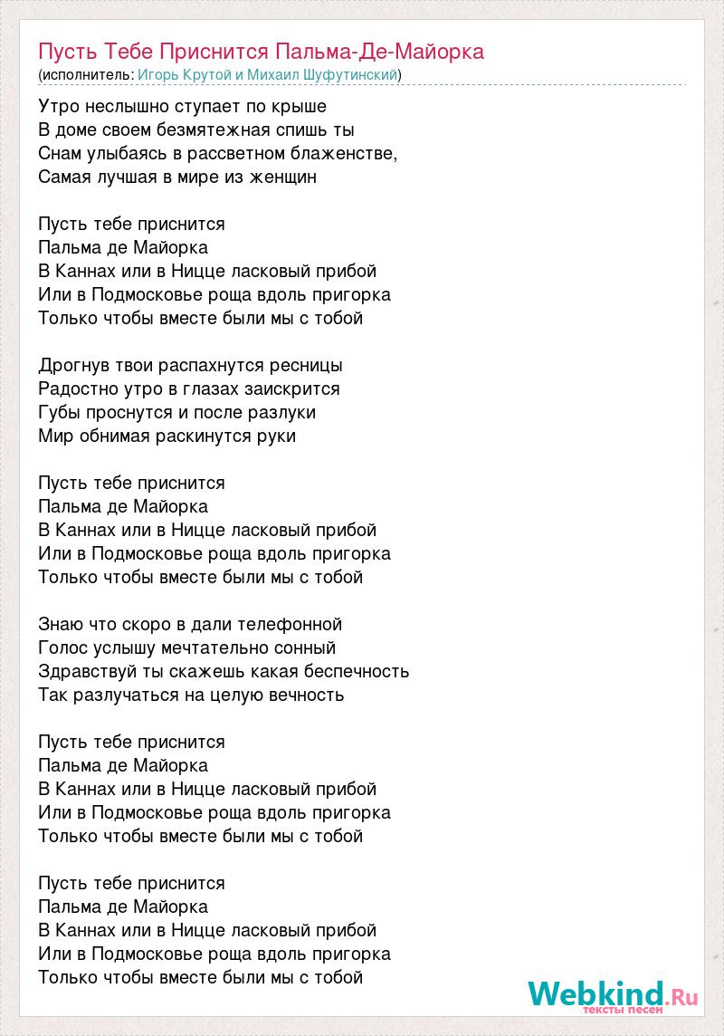 Утро неслышно ступает по крыше В доме своем безмятежная спишь ты Снам улыбаясь в рассветном блаженстве, Самая лучшая в мире из женщин Пусть тебе приснится Пальма де Майорка В Каннах или в Ницце ласковый прибой Или в Подмосковье роща вдоль пригорка Только чтобы вместе были мы с тобой Дрогнув твои распахнутся ресницы Радостно утро в глазах заискрится Губы проснутся и после разлуки Мир обнимая раскинутся руки Пусть тебе приснится Пальма де Майорка В Каннах или в Ницце ласковый прибой Или в Подмосковье роща вдоль пригорка Только чтобы вместе были мы с тобой Знаю что скоро в дали телефонной Голос услышу мечтательно сонный Здравствуй ты скажешь какая беспечность Так разлучаться на целую вечность Пусть тебе приснится Пальма де Майорка В Каннах или в Ницце ласковый прибой Или в Подмосковье роща вдоль пригорка Только чтобы вместе были мы с тобой Пусть тебе приснится Пальма де Майорка В Каннах или в Ницце ласковый прибой Или в Подмосковье роща вдоль пригорка Только чтобы вместе были мы с тобой