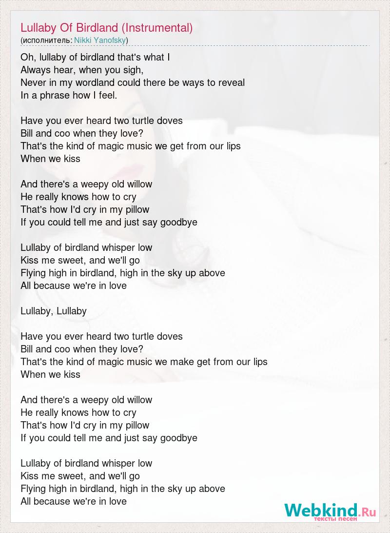 Oh, lullaby of birdland that's what I Always hear, when you sigh, Never in my wordland could there be ways to reveal In a phrase how I feel. Have you ever heard two turtle doves Bill and coo when they love? That's the kind of magic music we get from our lips When we kiss And there's a weepy old willow He really knows how to cry That's how I'd cry in my pillow If you could tell me and just say goodbye Lullaby of birdland whisper low Kiss me sweet, and we'll go Flying high in birdland, high in the sky up above All because we're in love Lullaby, Lullaby Have you ever heard two turtle doves Bill and coo when they love? That's the kind of magic music we make get from our lips When we kiss And there's a weepy old willow He really knows how to cry That's how I'd cry in my pillow If you could tell me and just say goodbye Lullaby of birdland whisper low Kiss me sweet, and we'll go Flying high in birdland, high in the sky up above All because we're in love
