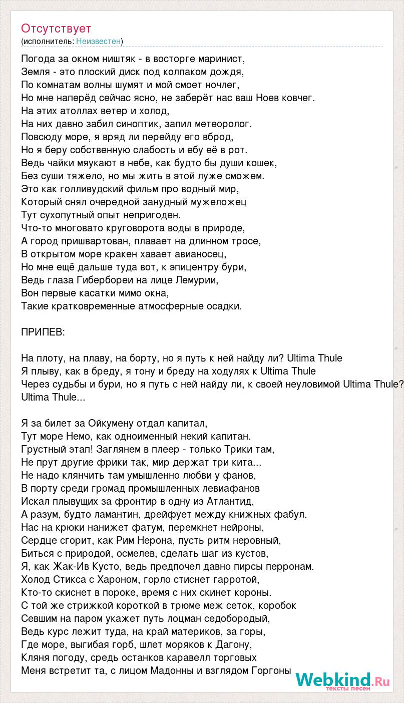 Погода за окном ништяк - в восторге маринист, Земля - это плоский диск под колпаком дождя, По комнатам волны шумят и мой смоет ночлег, Но мне наперёд сейчас ясно, не заберёт нас ваш Ноев ковчег. На этих атоллах ветер и холод, На них давно забил синоптик, запил метеоролог. Повсюду море, я вряд ли перейду его вброд, Но я беру собственную слабость и ебу её в рот. Ведь чайки мяукают в небе, как будто бы души кошек, Без суши тяжело, но мы жить в этой луже сможем. Это как голливудский фильм про водный мир, Который снял очередной занудный мужеложец Тут сухопутный опыт непригоден. Что-то многовато круговорота воды в природе, А город пришвартован, плавает на длинном тросе, В открытом море кракен хавает авианосец, Но мне ещё дальше туда вот, к эпицентру бури, Ведь глаза Гибербореи на лице Лемурии, Вон первые касатки мимо окна, Такие кратковременные атмосферные осадки. ПРИПЕВ: На плоту, на плаву, на борту, но я путь к ней найду ли? Ultima Thule Я плыву, как в бреду, я тону и бреду на ходулях к Ultima Thule Через судьбы и бури, но я путь с ней найду ли, к своей неуловимой Ultima Thule? Ultima Thule... Я за билет за Ойкумену отдал капитал, Тут море Немо, как одноименный некий капитан. Грустный этап! Заглянем в плеер - только Трики там, Не прут другие фрики так, мир держат три кита... Не надо клянчить там умышленно любви у фанов, В порту среди громад промышленных левиафанов Искал плывущих за фронтир в одну из Атлантид, А разум, будто ламантин, дрейфует между книжных фабул. Нас на крюки нанижет фатум, перемкнет нейроны, Сердце сгорит, как Рим Нерона, пусть ритм неровный, Биться с природой, осмелев, сделать шаг из кустов, Я, как Жак-Ив Кусто, ведь предпочел давно пирсы перронам. Холод Стикса с Хароном, горло стиснет гарротой, Кто-то скиснет в пороке, время с них скинет короны. С той же стрижкой короткой в трюме меж сеток, коробок Севшим на паром укажет путь лоцман седобородый, Ведь курс лежит туда, на край материков, за горы, Где море, выгибая горб, шлет моряков к Дагону, Кляня погоду, средь останков каравелл торговых Меня встретит та, с лицом Мадонны и взглядом Горгоны
