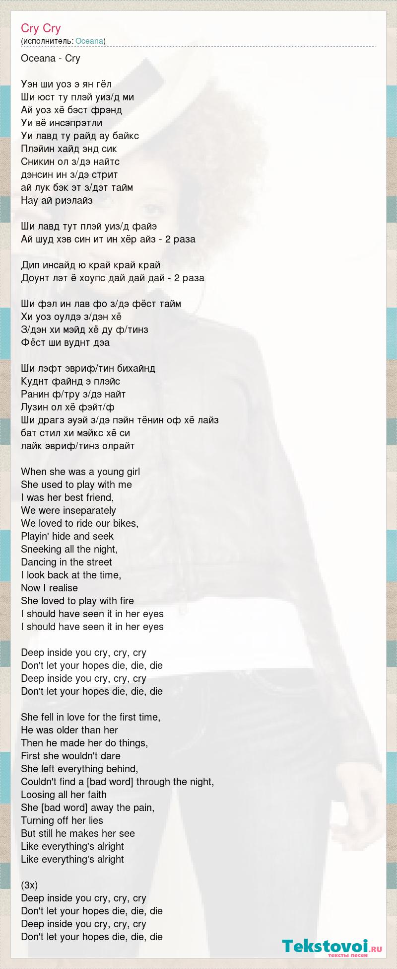 Oceana - Cry Уэн ши уоз э ян гёл Ши юст ту плэй уиз/д ми Ай уоз хё бэст фрэнд Уи вё инсэпрэтли Уи лавд ту райд ау байкс Плэйин хайд энд сик Сникин ол з/дэ найтс дэнсин ин з/дэ стрит ай лук бэк эт з/дэт тайм Нау ай риэлайз Ши лавд тут плэй уиз/д файэ Ай шуд хэв син ит ин хёр айз - 2 раза Дип инсайд ю край край край Доунт лэт ё хоупс дай дай дай - 2 раза Ши фэл ин лав фо з/дэ фёст тайм Хи уоз оулдэ з/дэн хё З/дэн хи мэйд хё ду ф/тинз Фёст ши вуднт дэа Ши лэфт эвриф/тин бихайнд Куднт файнд э плэйс Ранин ф/тру з/дэ найт Лузин ол хё фэйт/ф Ши драгз эуэй з/дэ пэйн тёнин оф хё лайз бат стил хи мэйкс хё си лайк эвриф/тинз олрайт When she was a young girl She used to play with me I was her best friend, We were inseparately We loved to ride our bikes, Playin' hide and seek Sneeking all the night, Dancing in the street I look back at the time, Now I realise She loved to play with fire I should have seen it in her eyes I should have seen it in her eyes Deep inside you cry, cry, cry Don't let your hopes die, die, die Deep inside you cry, cry, cry Don't let your hopes die, die, die She fell in love for the first time, He was older than her Then he made her do things, First she wouldn't dare She left everything behind, Couldn't find a place Running through the night, Loosing all her faith She drugs away the pain, Turning off her lies But still he makes her see Like everything's alright Like everything's alright (3x) Deep inside you cry, cry, cry Don't let your hopes die, die, die Deep inside you cry, cry, cry Don't let your hopes die, die, die