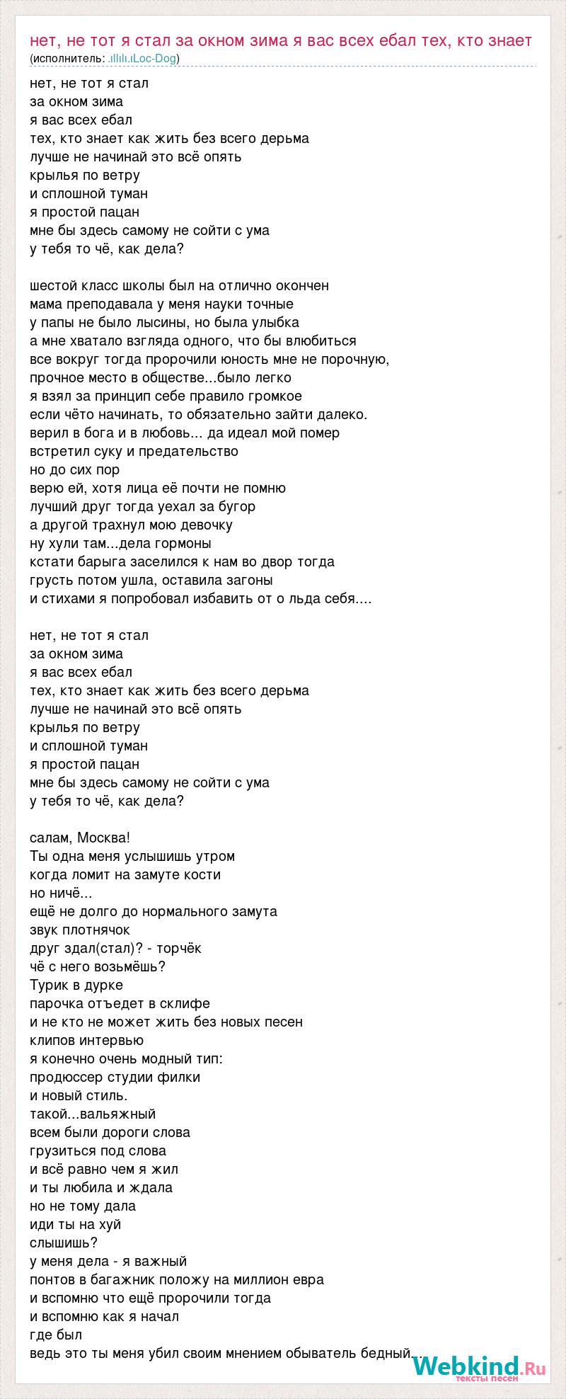 нет, не тот я стал за окном зима я вас всех ебал тех, кто знает как жить без всего дерьма лучше не начинай это всё опять крылья по ветру и сплошной туман я простой пацан мне бы здесь самому не сойти с ума у тебя то чё, как дела? шестой класс школы был на отлично окончен мама преподавала у меня науки точные у папы не было лысины, но была улыбка а мне хватало взгляда одного, что бы влюбиться все вокруг тогда пророчили юность мне не порочную, прочное место в обществе...было легко я взял за принцип себе правило громкое если чёто начинать, то обязательно зайти далеко. верил в бога и в любовь... да идеал мой помер встретил суку и предательство но до сих пор верю ей, хотя лица её почти не помню лучший друг тогда уехал за бугор а другой трахнул мою девочку ну хули там...дела гормоны кстати барыга заселился к нам во двор тогда грусть потом ушла, оставила загоны и стихами я попробовал избавить от о льда себя.... нет, не тот я стал за окном зима я вас всех ебал тех, кто знает как жить без всего дерьма лучше не начинай это всё опять крылья по ветру и сплошной туман я простой пацан мне бы здесь самому не сойти с ума у тебя то чё, как дела? салам, Москва! Ты одна меня услышишь утром когда ломит на замуте кости но ничё... ещё не долго до нормального замута звук плотнячок друг здал(стал)? - торчёк чё с него возьмёшь? Турик в дурке парочка отъедет в склифе и не кто не может жить без новых песен клипов интервью я конечно очень модный тип: продюссер студии филки и новый стиль. такой...вальяжный всем были дороги слова грузиться под слова и всё равно чем я жил и ты любила и ждала но не тому дала иди ты на хуй слышишь? у меня дела - я важный понтов в багажник положу на миллион евра и вспомню что ещё пророчили тогда и вспомню как я начал где был ведь это ты меня убил своим мнением обыватель бедный...