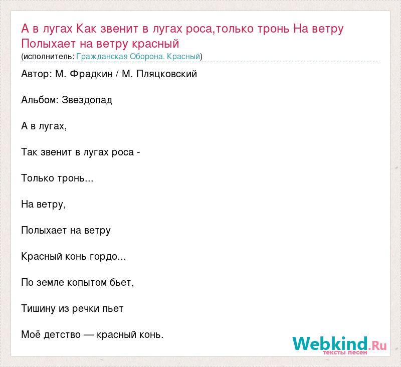 Главная→Исполнители→Гражданская Оборона. Красный→А в лугах Как звенит в лугах роса,только тронь На ветру Полыхает на ветр