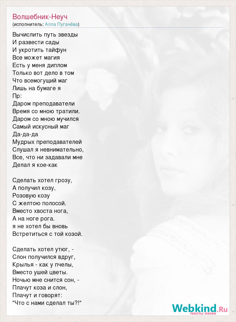 Вычислить путь звезды И развести сады И укротить тайфун Все может магия Есть у меня диплом Только вот дело в том Что всемогущий маг Лишь на бумаге я Пр: Даром преподаватели Время со мною тратили. Даром со мною мучился Самый искусный маг Да-да-да Мудрых преподавателей Слушал я невнимательно, Все, что ни задавали мне Делал я кое-как Сделать хотел грозу, А получил козу, Розовую козу С желтою полосой. Вместо хвоста нога, А на ноге рога. я не хотел бы вновь Встретиться с той козой. Сделать хотел утюг, - Слон получился вдруг, Крылья - как у пчелы, Вместо ушей цветы. Ночью мне снится сон, - Плачут коза и слон, Плачут и говорят: "Что с нами сделал ты?!"