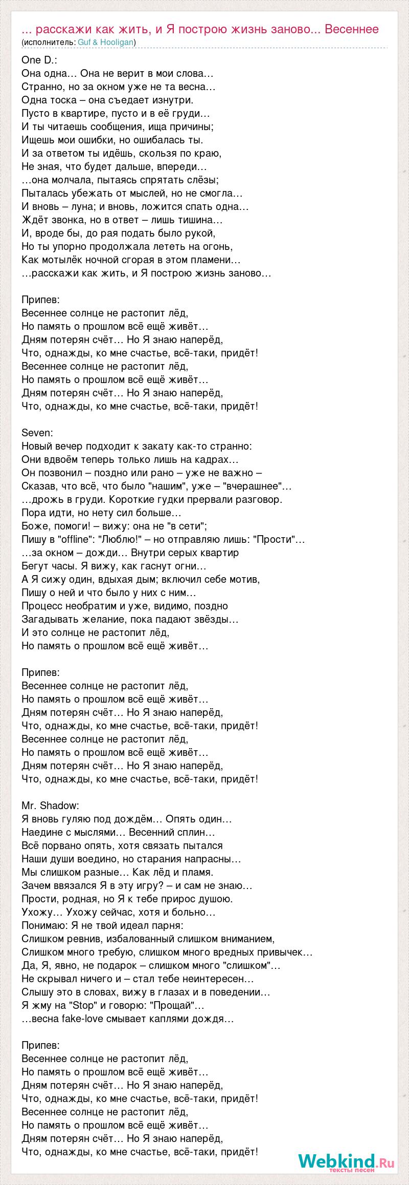 One D.: Она одна… Она не верит в мои слова… Странно, но за окном уже не та весна… Одна тоска – она съедает изнутри. Пусто в квартире, пусто и в её груди… И ты читаешь сообщения, ища причины; Ищешь мои ошибки, но ошибалась ты. И за ответом ты идёшь, скользя по краю, Не зная, что будет дальше, впереди… …она молчала, пытаясь спрятать слёзы; Пыталась убежать от мыслей, но не смогла… И вновь – луна; и вновь, ложится спать одна… Ждёт звонка, но в ответ – лишь тишина… И, вроде бы, до рая подать было рукой, Но ты упорно продолжала лететь на огонь, Как мотылёк ночной сгорая в этом пламени… …расскажи как жить, и Я построю жизнь заново… Припев: Весеннее солнце не растопит лёд, Но память о прошлом всё ещё живёт… Дням потерян счёт… Но Я знаю наперёд, Что, однажды, ко мне счастье, всё-таки, придёт! Весеннее солнце не растопит лёд, Но память о прошлом всё ещё живёт… Дням потерян счёт… Но Я знаю наперёд, Что, однажды, ко мне счастье, всё-таки, придёт! Seven: Новый вечер подходит к закату как-то странно: Они вдвоём теперь только лишь на кадрах… Он позвонил – поздно или рано – уже не важно – Сказав, что всё, что было "нашим", уже – "вчерашнее"… …дрожь в груди. Короткие гудки прервали разговор. Пора идти, но нету сил больше… Боже, помоги! – вижу: она не "в сети"; Пишу в "offline": "Люблю!" – но отправляю лишь: "Прости"… …за окном – дожди… Внутри серых квартир Бегут часы. Я вижу, как гаснут огни… А Я сижу один, вдыхая дым; включил себе мотив, Пишу о ней и что было у них с ним… Процесс необратим и уже, видимо, поздно Загадывать желание, пока падают звёзды… И это солнце не растопит лёд, Но память о прошлом всё ещё живёт… Припев: Весеннее солнце не растопит лёд, Но память о прошлом всё ещё живёт… Дням потерян счёт… Но Я знаю наперёд, Что, однажды, ко мне счастье, всё-таки, придёт! Весеннее солнце не растопит лёд, Но память о прошлом всё ещё живёт… Дням потерян счёт… Но Я знаю наперёд, Что, однажды, ко мне счастье, всё-таки, придёт! Mr. Shadow: Я вновь гуляю под дождём… Опять один… Наедине с мыслями… Весенний сплин… Всё порвано опять, хотя связать пытался Наши души воедино, но старания напрасны… Мы слишком разные… Как лёд и пламя. Зачем ввязался Я в эту игру? – и сам не знаю… Прости, родная, но Я к тебе прирос душою. Ухожу… Ухожу сейчас, хотя и больно… Понимаю: Я не твой идеал парня: Слишком ревнив, избалованный слишком вниманием, Слишком много требую, слишком много вредных привычек… Да, Я, явно, не подарок – слишком много "слишком"… Не скрывал ничего и – стал тебе неинтересен… Слышу это в словах, вижу в глазах и в поведении… Я жму на "Stop" и говорю: "Прощай"… …весна fake-love смывает каплями дождя… Припев: Весеннее солнце не растопит лёд, Но память о прошлом всё ещё живёт… Дням потерян счёт… Но Я знаю наперёд, Что, однажды, ко мне счастье, всё-таки, придёт! Весеннее солнце не растопит лёд, Но память о прошлом всё ещё живёт… Дням потерян счёт… Но Я знаю наперёд, Что, однажды, ко мне счастье, всё-таки, придёт!