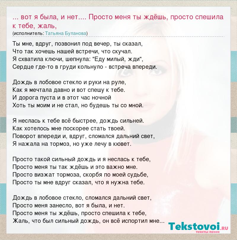 Главная→Исполнители→Татьяна Буланова→... вот я была, и нет.... Просто меня ты ждёшь, просто спешила к тебе, жаль,