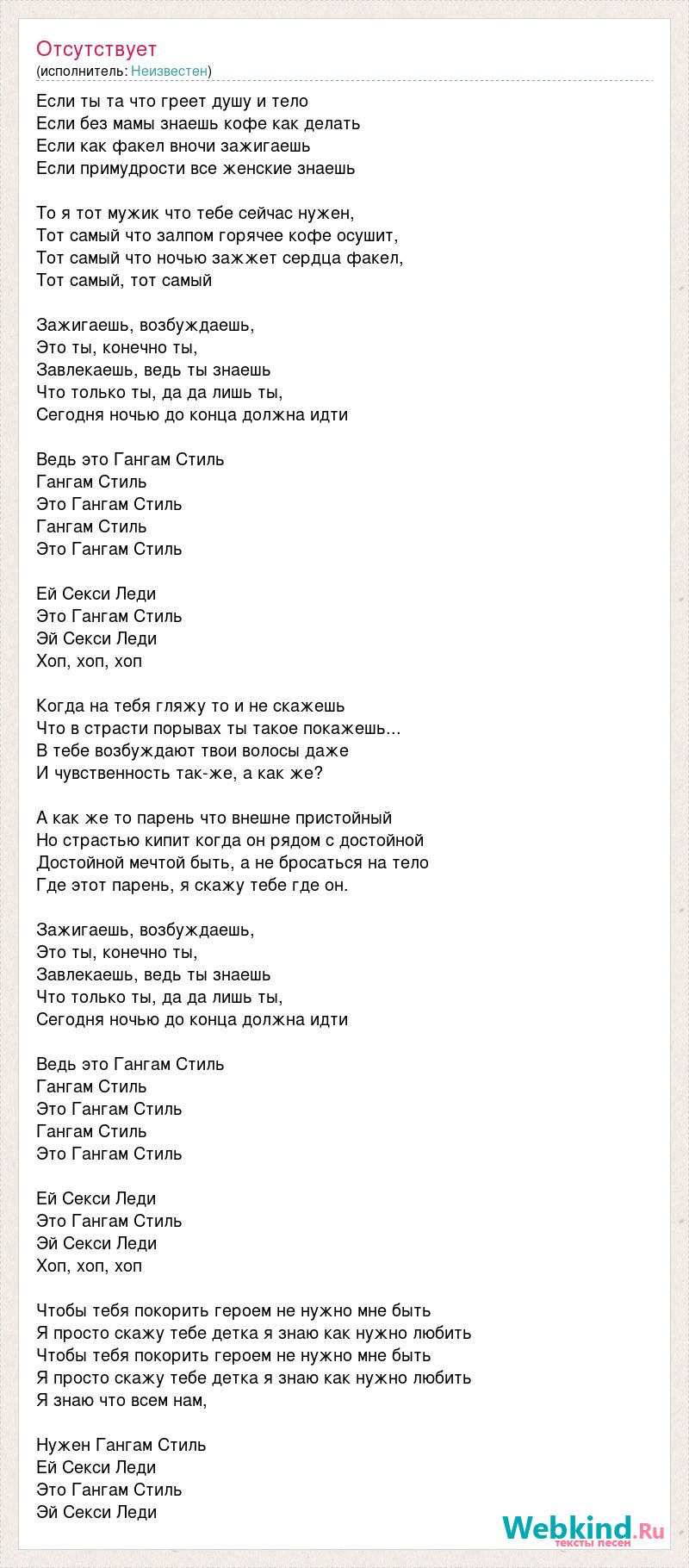 Если ты та что греет душу и тело Если без мамы знаешь кофе как делать Если как факел вночи зажигаешь Если примудрости все женские знаешь То я тот мужик что тебе сейчас нужен, Тот самый что залпом горячее кофе осушит, Тот самый что ночью зажжет сердца факел, Тот самый, тот самый Зажигаешь, возбуждаешь, Это ты, конечно ты, Завлекаешь, ведь ты знаешь Что только ты, да да лишь ты, Сегодня ночью до конца должна идти Ведь это Гангам Стиль Гангам Стиль Это Гангам Стиль Гангам Стиль Это Гангам Стиль Ей Секси Леди Это Гангам Стиль Эй Секси Леди Хоп, хоп, хоп Когда на тебя гляжу то и не скажешь Что в страсти порывах ты такое покажешь... В тебе возбуждают твои волосы даже И чувственность так-же, а как же? А как же то парень что внешне пристойный Но страстью кипит когда он рядом с достойной Достойной мечтой быть, а не бросаться на тело Где этот парень, я скажу тебе где он. Зажигаешь, возбуждаешь, Это ты, конечно ты, Завлекаешь, ведь ты знаешь Что только ты, да да лишь ты, Сегодня ночью до конца должна идти Ведь это Гангам Стиль Гангам Стиль Это Гангам Стиль Гангам Стиль Это Гангам Стиль Ей Секси Леди Это Гангам Стиль Эй Секси Леди Хоп, хоп, хоп Чтобы тебя покорить героем не нужно мне быть Я просто скажу тебе детка я знаю как нужно любить Чтобы тебя покорить героем не нужно мне быть Я просто скажу тебе детка я знаю как нужно любить Я знаю что всем нам, Нужен Гангам Стиль Ей Секси Леди Это Гангам Стиль Эй Секси Леди