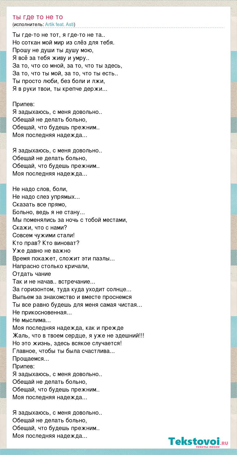 Ты где-то не тот, я где-то не та.. Но соткан мой мир из слёз для тебя. Прошу не души ты душу мою, Я всё за тебя живу и умру.. За то, что со мной, за то, что ты здесь, За то, что ты мой, за то, что ты есть.. Ты просто люби, без боли и лжи, Я в руки твои, ты крепче держи... Припев: Я задыхаюсь, с меня довольно.. Обещай не делать больно, Обещай, что будешь прежним.. Моя последняя надежда... Я задыхаюсь, с меня довольно.. Обещай не делать больно, Обещай, что будешь прежним.. Моя последняя надежда... Не надо слов, боли, Не надо слез упрямых... Сказать все прямо, Больно, ведь я не стану... Мы поменялись за ночь с тобой местами, Скажи, что с нами? Совсем чужими стали! Кто прав? Кто виноват? Уже давно не важно Время покажет, сложит эти пазлы... Напрасно столько кричали, Отдать чание Так и не начав.. встречание... За горизонтом, туда куда уходит солнце... Выпьем за знакомство и вместе проснемся Ты все равно будешь для меня самая чистая... Не прикосновенная... Не мыслима... Моя последняя надежда, как и прежде Жаль, что в твоем сердце, я уже не здешний!!! Но это жизнь, здесь всякое случается! Главное, чтобы ты была счастлива... Прощаемся... Припев: Я задыхаюсь, с меня довольно.. Обещай не делать больно, Обещай, что будешь прежним.. Моя последняя надежда... Я задыхаюсь, с меня довольно.. Обещай не делать больно, Обещай, что будешь прежним.. Моя последняя надежда...