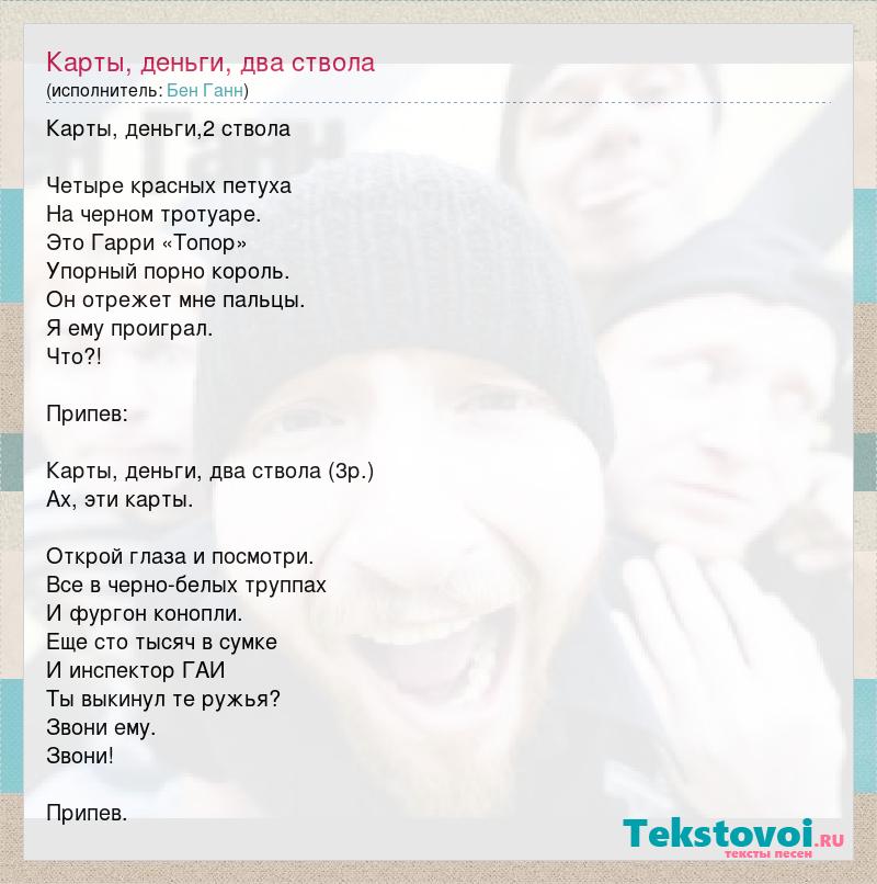 Карты, деньги,2 ствола Четыре красных петуха На черном тротуаре. Это Гарри «Топор» Упорный порно король. Он отрежет мне пальцы. Я ему проиграл. Что?! Припев: Карты, деньги, два ствола (3р.) Ах, эти карты. Открой глаза и посмотри. Все в черно-белых труппах И фургон конопли. Еще сто тысяч в сумке И инспектор ГАИ Ты выкинул те ружья? Звони ему. Звони! Припев.