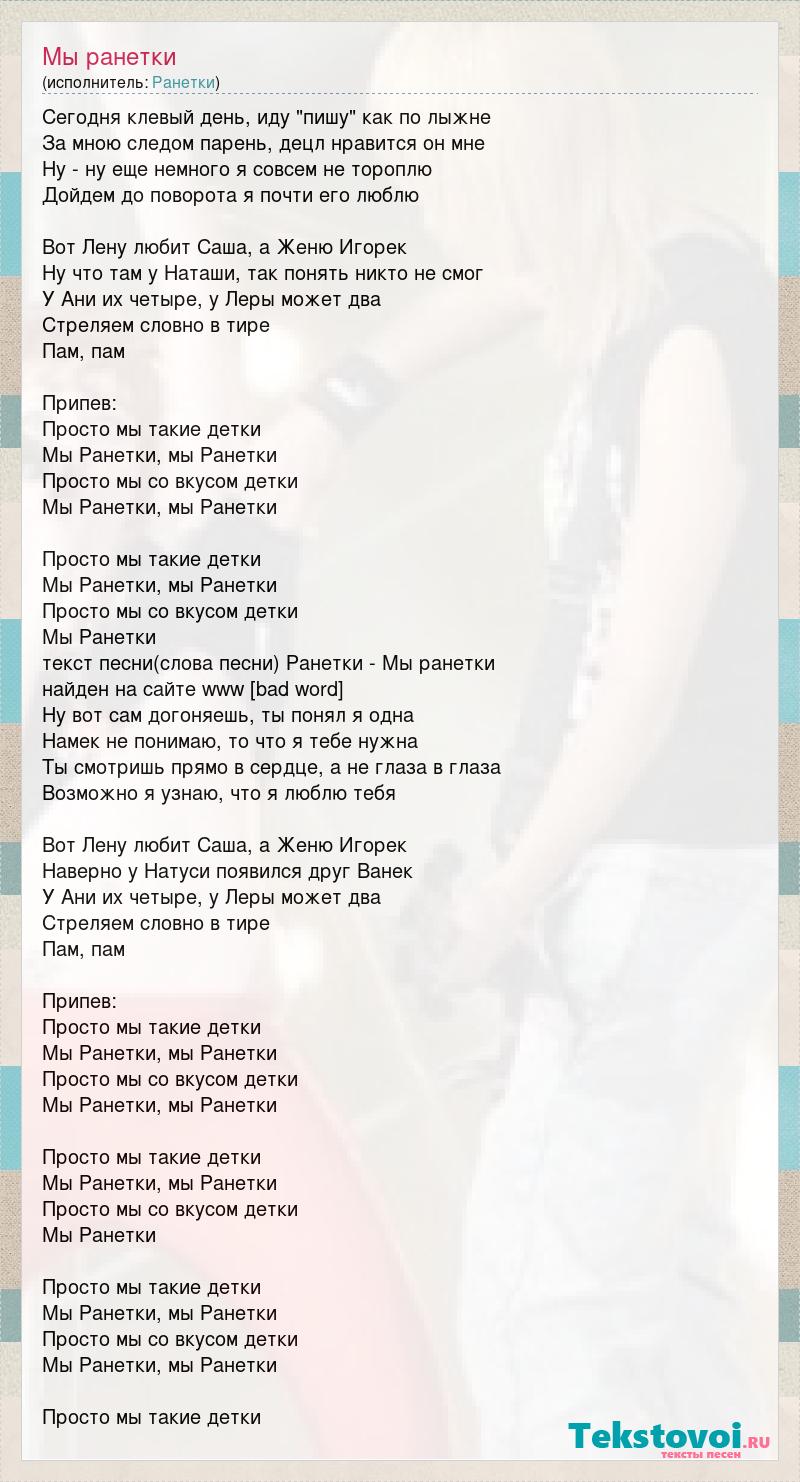 Сегодня клевый день, иду "пишу" как по лыжне За мною следом парень, децл нравится он мне Ну - ну еще немного я совсем не тороплю Дойдем до поворота я почти его люблю Вот Лену любит Саша, а Женю Игорек Ну что там у Наташи, так понять никто не смог У Ани их четыре, у Леры может два Стреляем словно в тире Пам, пам Припев: Просто мы такие детки Мы Ранетки, мы Ранетки Просто мы со вкусом детки Мы Ранетки, мы Ранетки Просто мы такие детки Мы Ранетки, мы Ранетки Просто мы со вкусом детки Мы Ранетки текст песни(слова песни) Ранетки - Мы ранетки найден на сайте www [bad word] Ну вот сам догоняешь, ты понял я одна Намек не понимаю, то что я тебе нужна Ты смотришь прямо в сердце, а не глаза в глаза Возможно я узнаю, что я люблю тебя Вот Лену любит Саша, а Женю Игорек Наверно у Натуси появился друг Ванек У Ани их четыре, у Леры может два Стреляем словно в тире Пам, пам Припев: Просто мы такие детки Мы Ранетки, мы Ранетки Просто мы со вкусом детки Мы Ранетки, мы Ранетки Просто мы такие детки Мы Ранетки, мы Ранетки Просто мы со вкусом детки Мы Ранетки Просто мы такие детки Мы Ранетки, мы Ранетки Просто мы со вкусом детки Мы Ранетки, мы Ранетки Просто мы такие детки