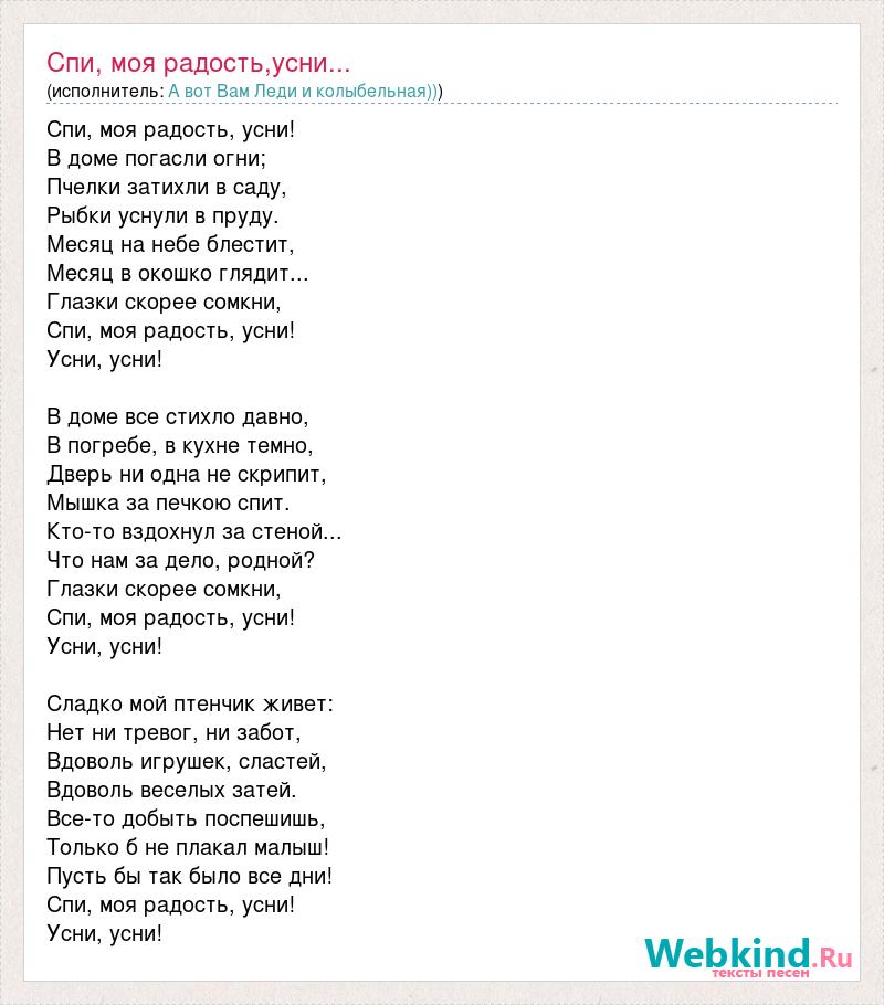 Спи, моя радость, усни! В доме погасли огни; Пчелки затихли в саду, Рыбки уснули в пруду. Месяц на небе блестит, Месяц в окошко глядит... Глазки скорее сомкни, Спи, моя радость, усни! Усни, усни! В доме все стихло давно, В погребе, в кухне темно, Дверь ни одна не скрипит, Мышка за печкою спит. Кто-то вздохнул за стеной... Что нам за дело, родной? Глазки скорее сомкни, Спи, моя радость, усни! Усни, усни! Сладко мой птенчик живет: Нет ни тревог, ни забот, Вдоволь игрушек, сластей, Вдоволь веселых затей. Все-то добыть поспешишь, Только б не плакал малыш! Пусть бы так было все дни! Спи, моя радость, усни! Усни, усни!