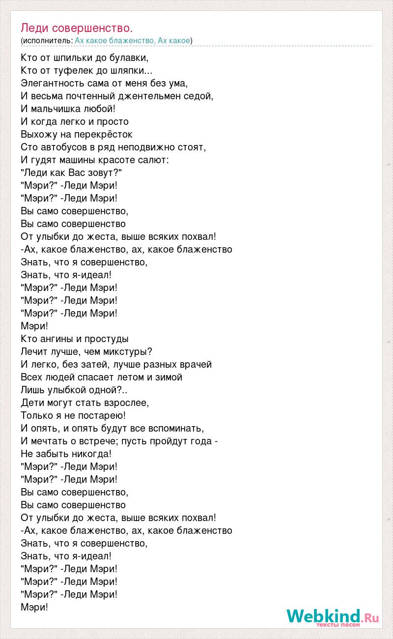 Кто от шпильки до булавки, Кто от туфелек до шляпки... Элегантность сама от меня без ума, И весьма почтенный джентельмен седой, И мальчишка любой! И когда легко и просто Выхожу на перекрёсток Сто автобусов в ряд неподвижно стоят, И гудят машины красоте салют: "Леди как Вас зовут?" "Мэри?" -Леди Мэри! "Мэри?" -Леди Мэри! Вы само совершенство, Вы само совершенство От улыбки до жеста, выше всяких похвал! -Ах, какое блаженство, ах, какое блаженство Знать, что я совершенство, Знать, что я-идеал! "Мэри?" -Леди Мэри! "Мэри?" -Леди Мэри! "Мэри?" -Леди Мэри! Мэри! Кто ангины и простуды Лечит лучше, чем микстуры? И легко, без затей, лучше разных врачей Всех людей спасает летом и зимой Лишь улыбкой одной?.. Дети могут стать взрослее, Только я не постарею! И опять, и опять будут все вспоминать, И мечтать о встрече; пусть пройдут года - Не забыть никогда! "Мэри?" -Леди Мэри! "Мэри?" -Леди Мэри! Вы само совершенство, Вы само совершенство От улыбки до жеста, выше всяких похвал! -Ах, какое блаженство, ах, какое блаженство Знать, что я совершенство, Знать, что я-идеал! "Мэри?" -Леди Мэри! "Мэри?" -Леди Мэри! "Мэри?" -Леди Мэри! Мэри!