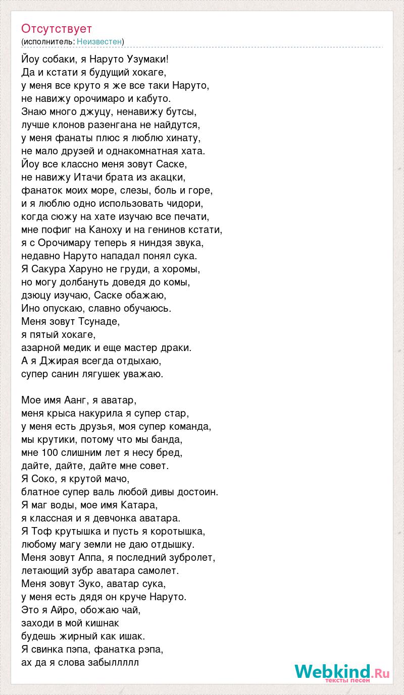 Йоу собаки, я Наруто Узумаки! Да и кстати я будущий хокаге, у меня все круто я же все таки Наруто, не навижу орочимаро и кабуто. Знаю много джуцу, ненавижу бутсы, лучше клонов разенгана не найдутся, у меня фанаты плюс я люблю хинату, не мало друзей и однакомнатная хата. Йоу все классно меня зовут Саске, не навижу Итачи брата из акацки, фанаток моих море, слезы, боль и горе, и я люблю одно использовать чидори, когда сюжу на хате изучаю все печати, мне пофиг на Каноху и на генинов кстати, я с Орочимару теперь я ниндзя звука, недавно Наруто нападал понял сука. Я Сакура Харуно не груди, а хоромы, но могу долбануть доведя до комы, дзюцу изучаю, Саске обажаю, Ино опускаю, славно обучаюсь. Меня зовут Тсунаде, я пятый хокаге, азарной медик и еще мастер драки. А я Джирая всегда отдыхаю, супер санин лягушек уважаю. Мое имя Аанг, я аватар, меня крыса накурила я супер стар, у меня есть друзья, моя супер команда, мы крутики, потому что мы банда, мне 100 слишним лет я несу бред, дайте, дайте, дайте мне совет. Я Соко, я крутой мачо, блатное супер валь любой дивы достоин. Я маг воды, мое имя Катара, я классная и я девчонка аватара. Я Тоф крутышка и пусть я коротышка, любому магу земли не даю отдышку. Меня зовут Аппа, я последний зубролет, летающий зубр аватара самолет. Меня зовут Зуко, аватар сука, у меня есть дядя он круче Наруто. Это я Айро, обожаю чай, заходи в мой кишнак будешь жирный как ишак. Я свинка пэпа, фанатка рэпа, ах да я слова забыллллл