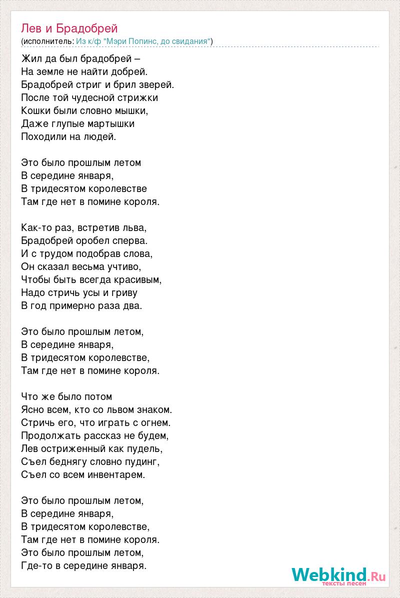 Жил да был брадобрей – На земле не найти добрей. Брадобрей стриг и брил зверей. После той чудесной стрижки Кошки были словно мышки, Даже глупые мартышки Походили на людей. Это было прошлым летом В середине января, В тридесятом королевстве Там где нет в помине короля. Как-то раз, встретив льва, Брадобрей оробел сперва. И с трудом подобрав слова, Он сказал весьма учтиво, Чтобы быть всегда красивым, Надо стричь усы и гриву В год примерно раза два. Это было прошлым летом, В середине января, В тридесятом королевстве, Там где нет в помине короля. Что же было потом Ясно всем, кто со львом знаком. Стричь его, что играть с огнем. Продолжать рассказ не будем, Лев остриженный как пудель, Съел беднягу словно пудинг, Съел со всем инвентарем. Это было прошлым летом, В середине января, В тридесятом королевстве, Там где нет в помине короля. Это было прошлым летом, Где-то в середине января.